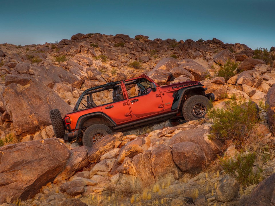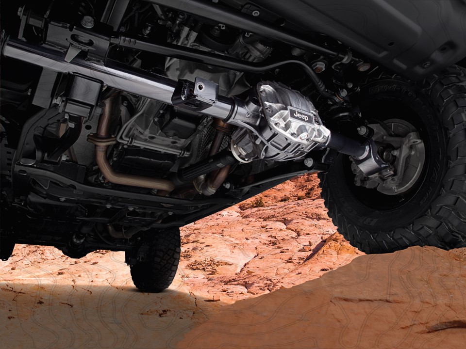 Como no podía ser de otro modo en un vehículo con tal pedigree todoterreno, este Jeep ofrece neumáticos 35 pulgadas y una altura libre sobre el suelo de 32.8 centímetros que le permite un vadeo de hasta 85.3 centímetros (sin que ni una gota de agua entre al habitáculo).
