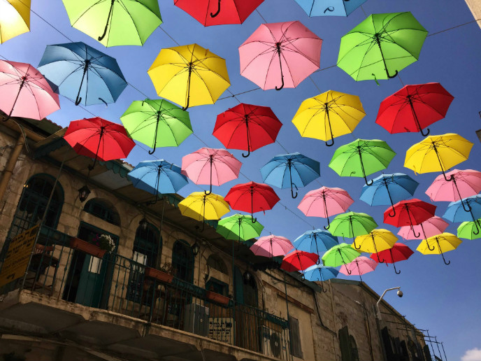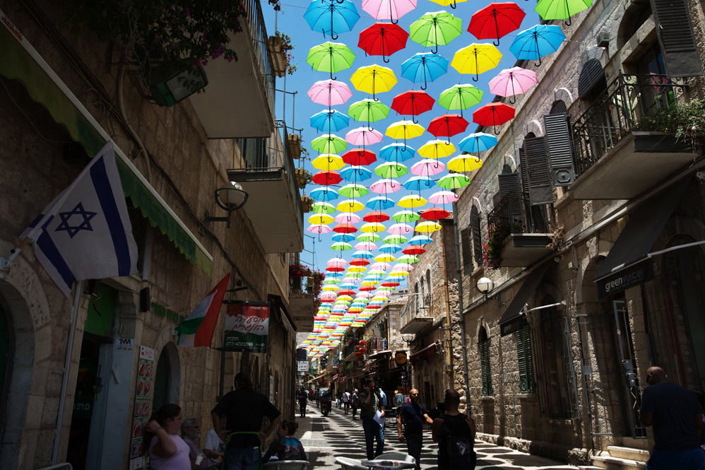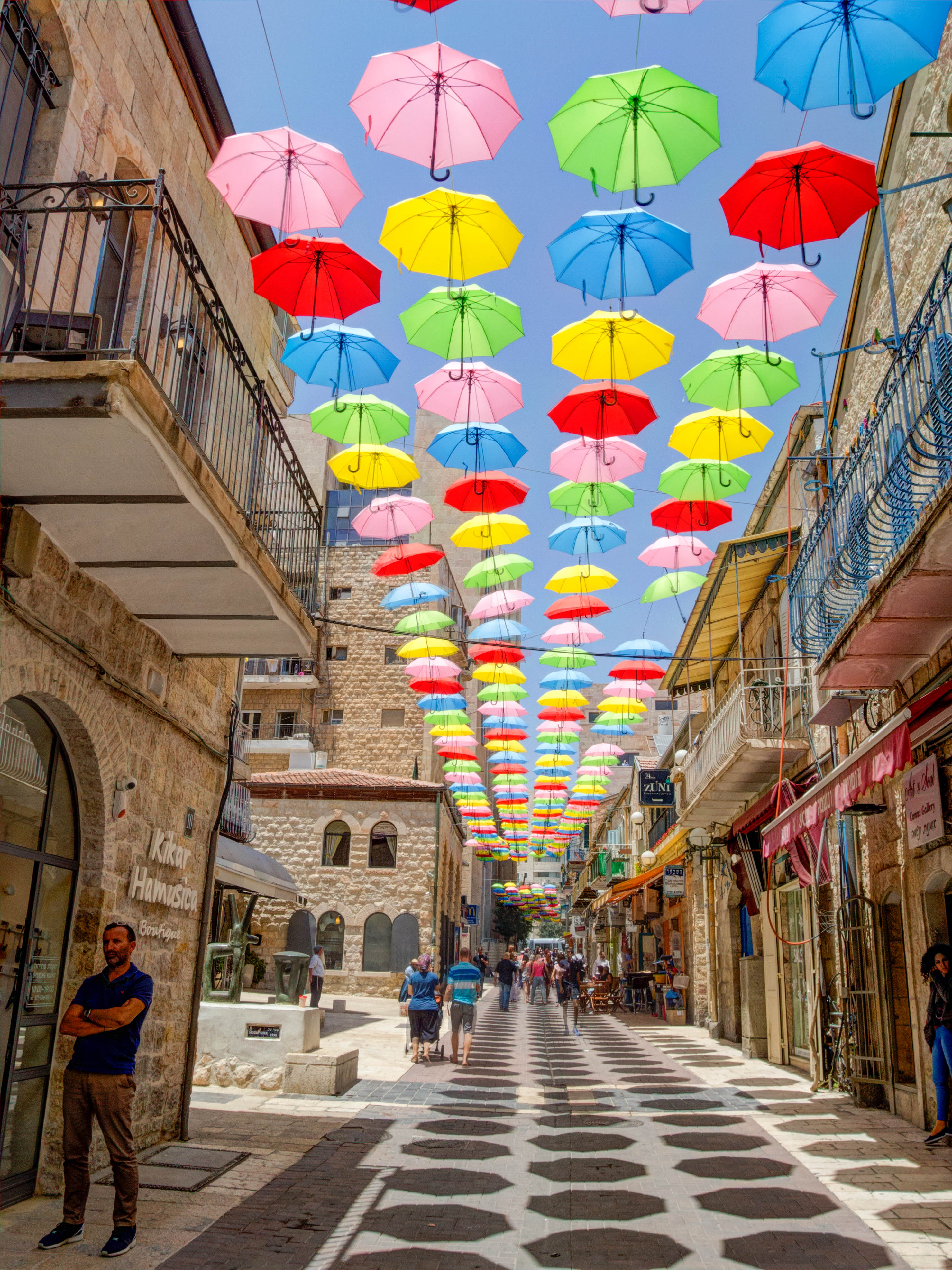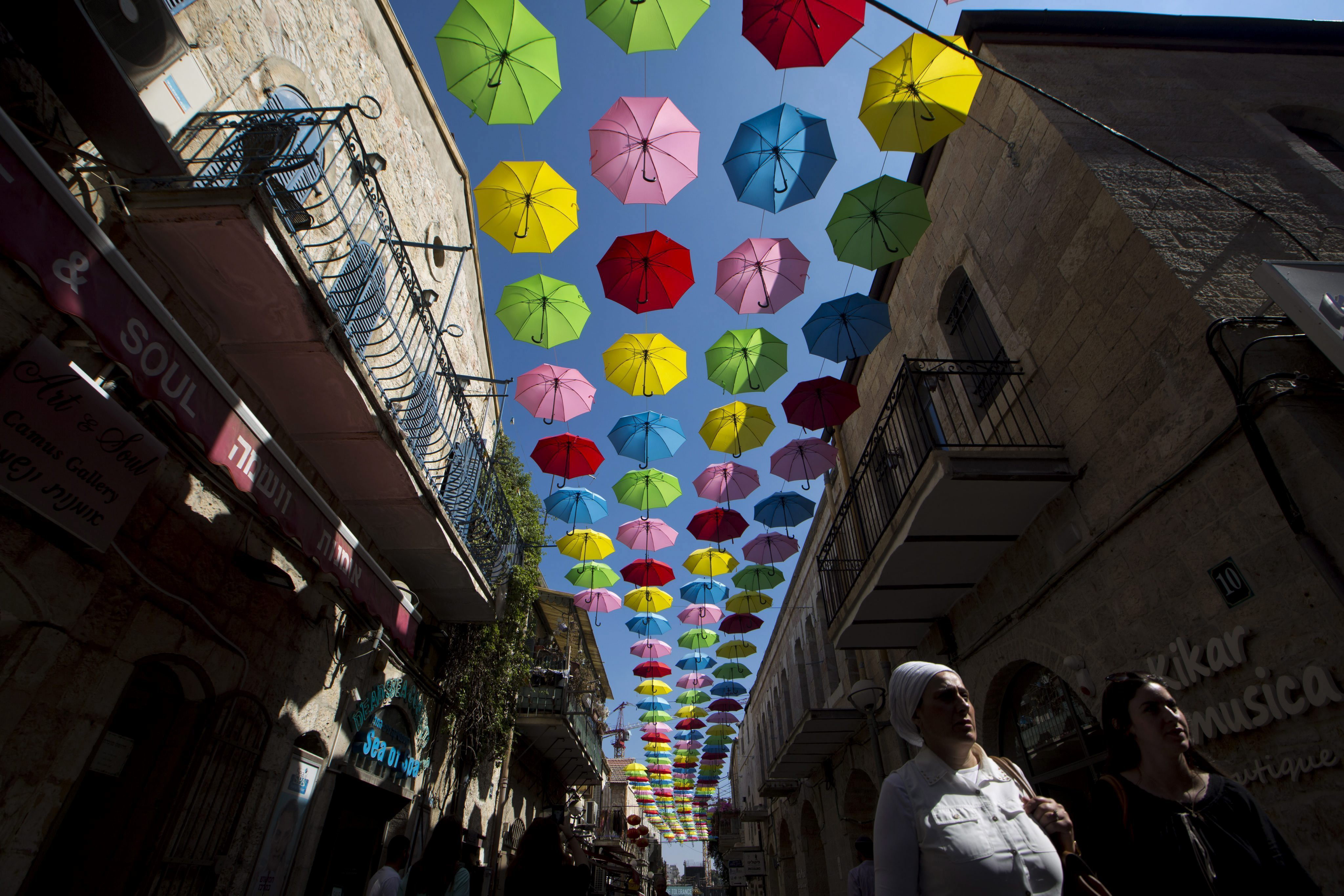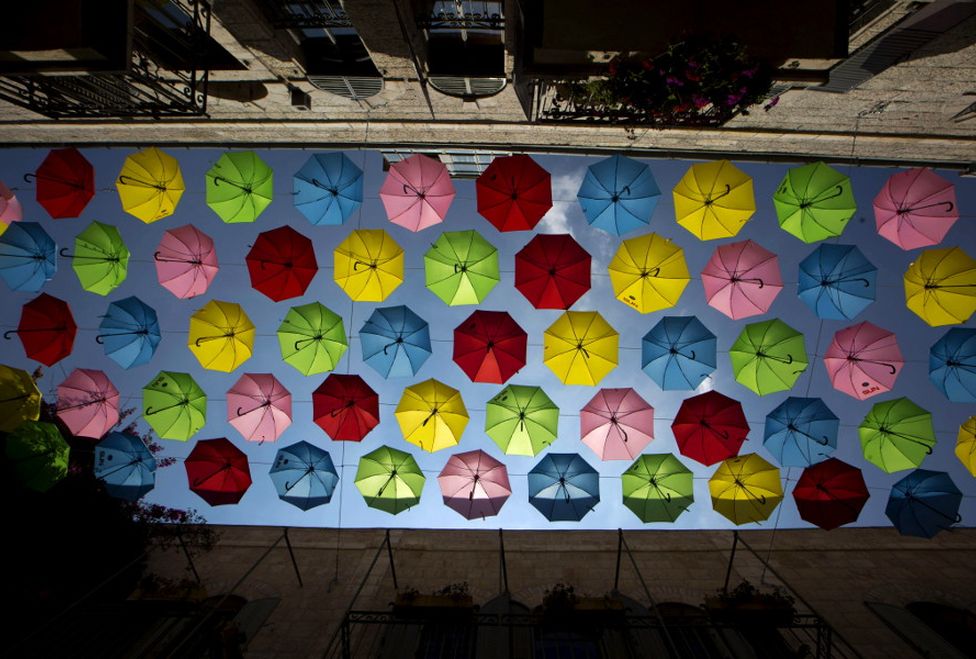 Caminar entre calles llenas de historia es uno de los mejores placeres de la vida, sin embargo existen cosas que revolucionan ese andar y lo convierten en una experiencia totalmente diferente. Un ejemplo de ello es Jerusalem, lugar que ha decido decorar lo alto de sus calles con sombrillas de colores.