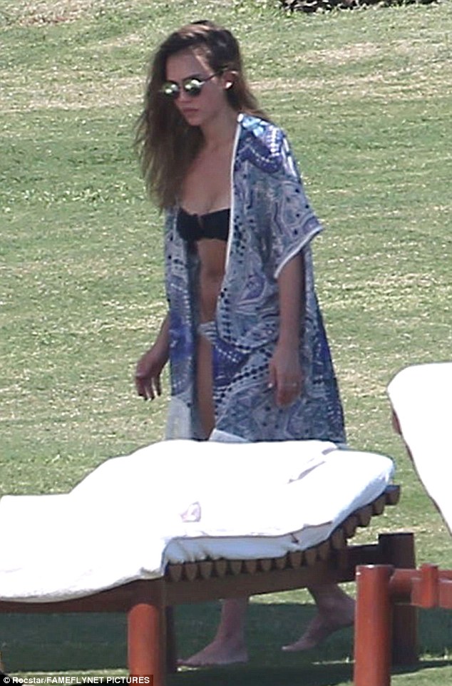 La protagonista de “Los 4 fantásticos” fue captada luciendo un bikini negro combinado con unos cómodos pantalones estilo boho de color azul y blanco.