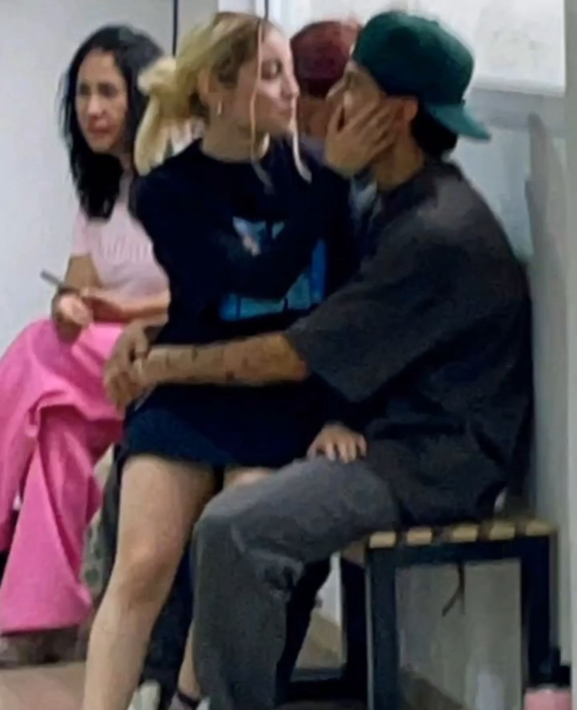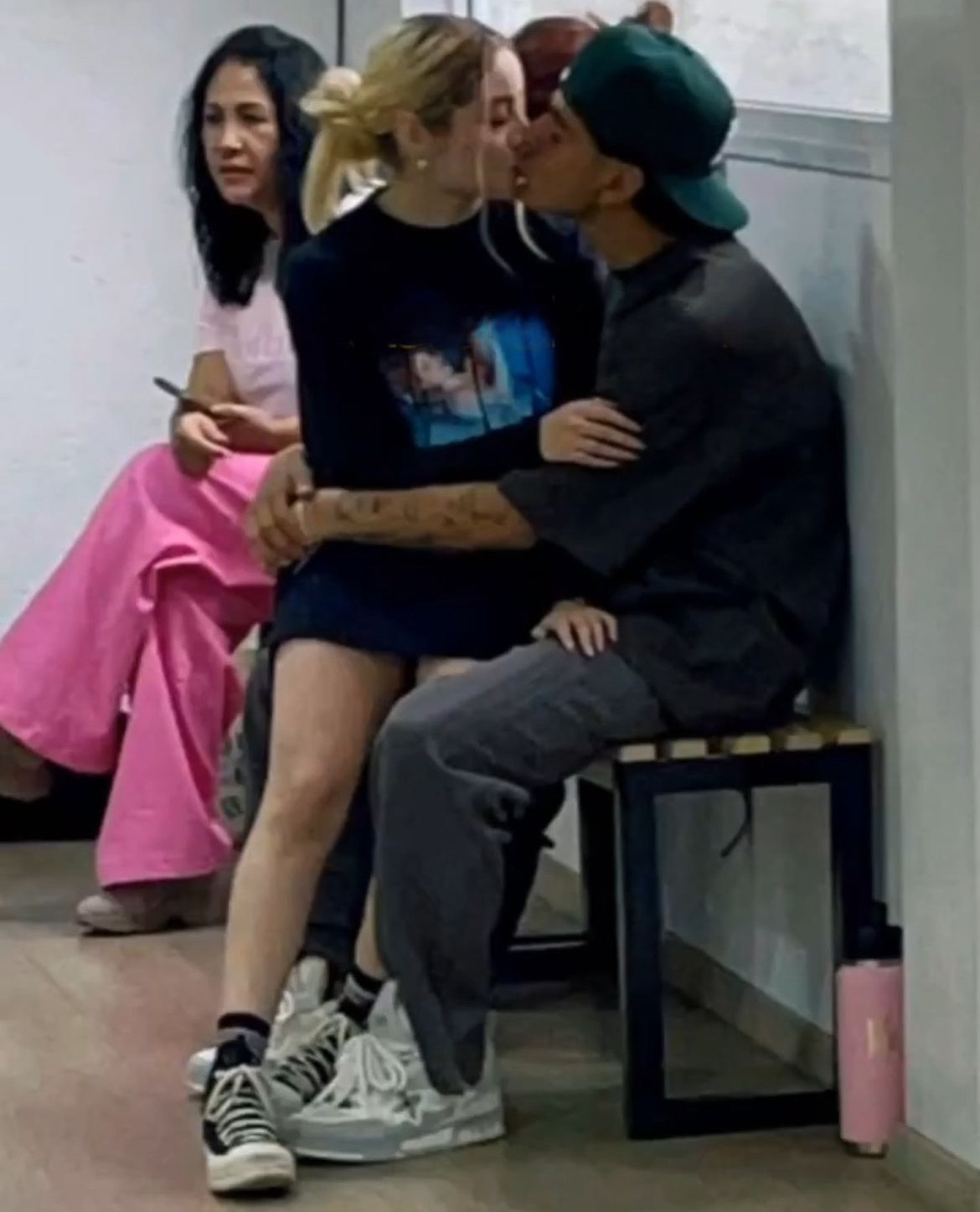 Las imágenes muestran a la actriz y cantante de 24 años sentada en las piernas de Monroy, quien la abrazaba cariñosamente mientras compartían un momento íntimo, sin preocuparse por la presencia de su equipo ni de su madre, quien también se encontraba en el ensayo.