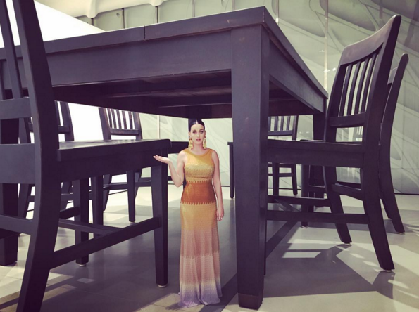 La intérprete de ‘Dark Horse’ admitió que fue una “ratoncita de museo” durante el día de su cumpleaños y al mismo tiempo comento: “cuando tienes 31 pero aún te sientes pequeña”, al lado de una instalación en tamaño gigante de una mesa para cenar.