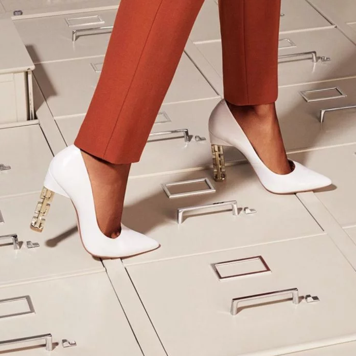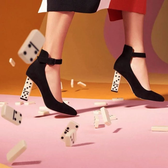 La serie esta conformada con zapatos con tacones en forma de cubos rubik o piezas de dominó, botines, tenis y sandalias.