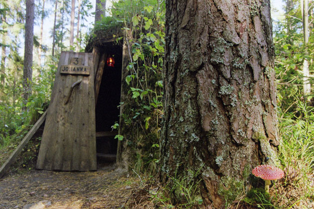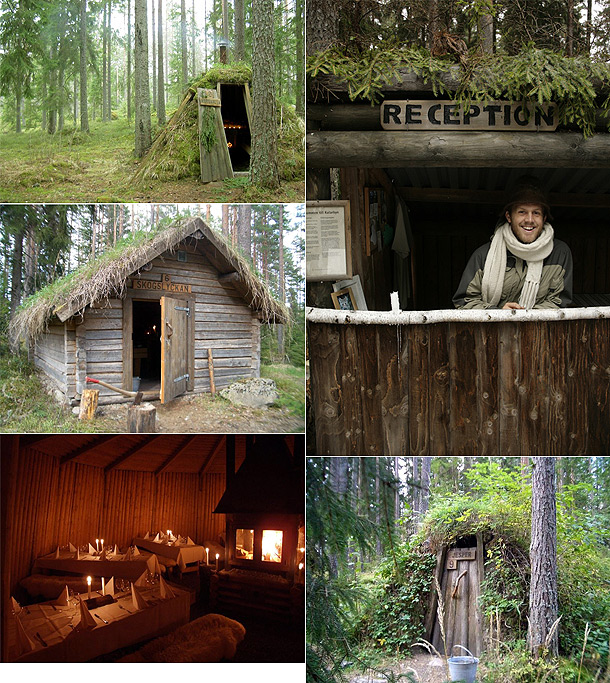 Las cabañas son habitaciones con camuflaje entre el bosque y sólo cuentan con dos camas individuales, los sanitarios se encuentran fuera de ésta. Todas las chozas están cubiertas de hojas y cortezas (nieve cuando es la temporada).