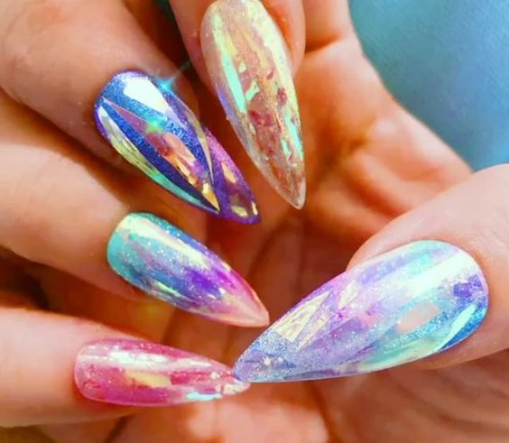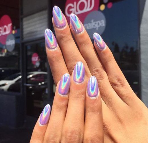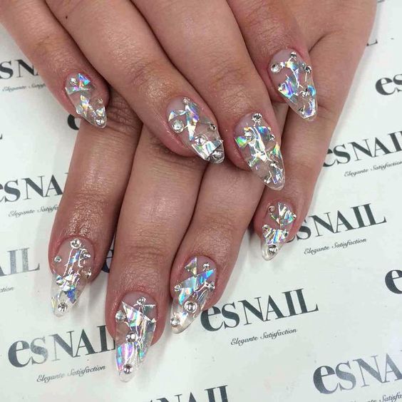 Esta tendencia surgió en Corea del Sur, pero ha encantado a todo Instagram… Y si tu quieres lucir un nail art sumamente resplandeciente, lo único que debes hacer es pegar pedazos de figuras geométricas de celofán y agregar un acabado holográfico.