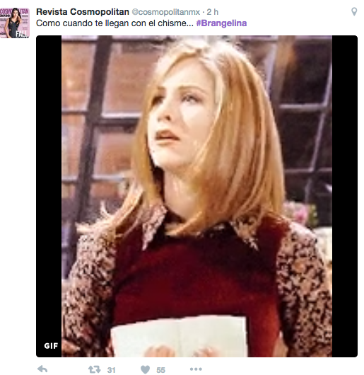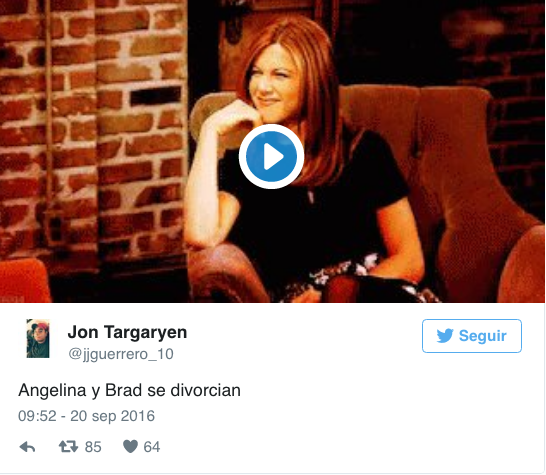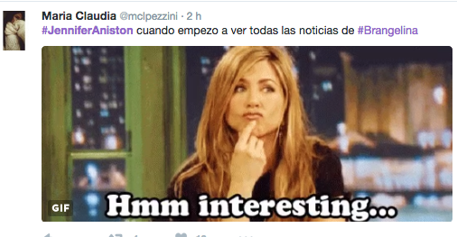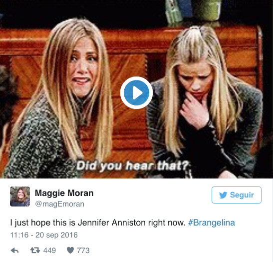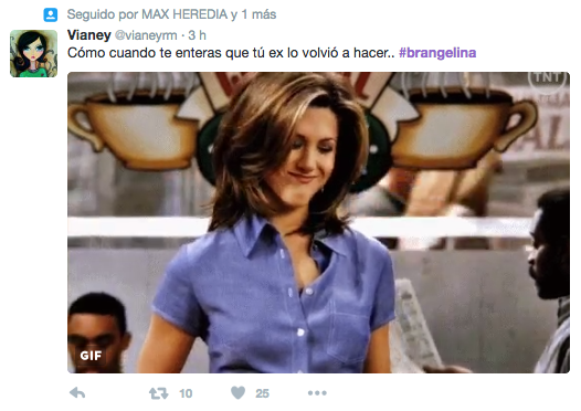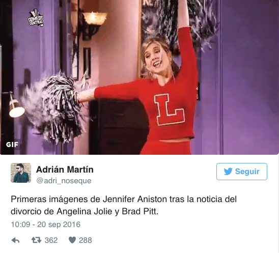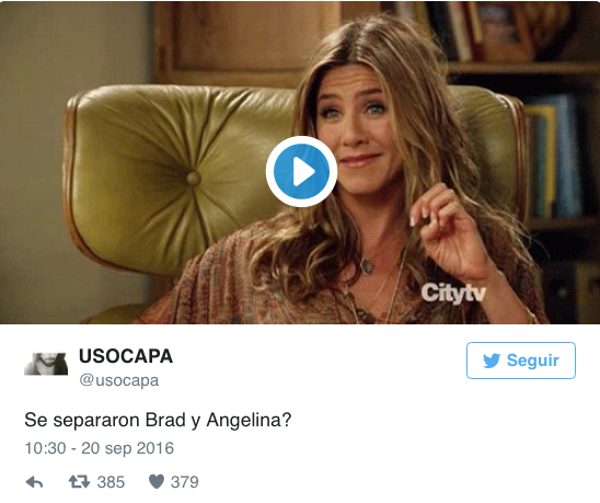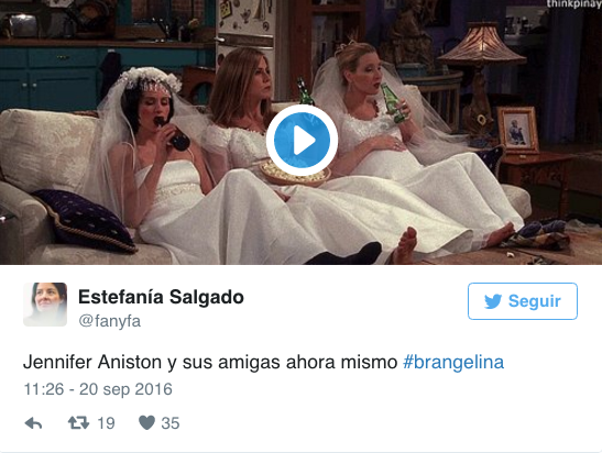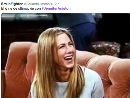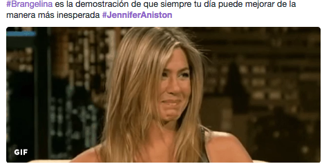 Aniston aparece en las imágenes burlándose de la separación de esta pareja. Los seguidores han utilizado escenas de las películas y series en las que apareció Aniston para hacer sus bromas. Aquí las más destacadas: