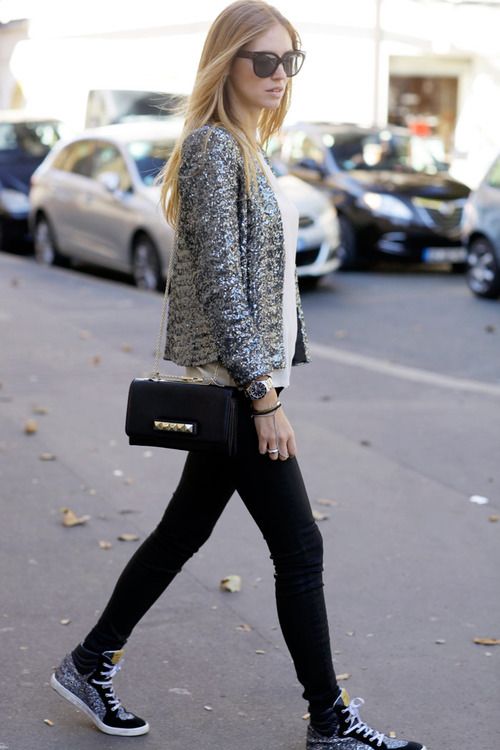 Y si quieres utilizar tu falda de lentejuelas en un día normal, solo bastará combinarla con una t shit blanca y tus sneakers favoritos. Serás la más chic del street style.