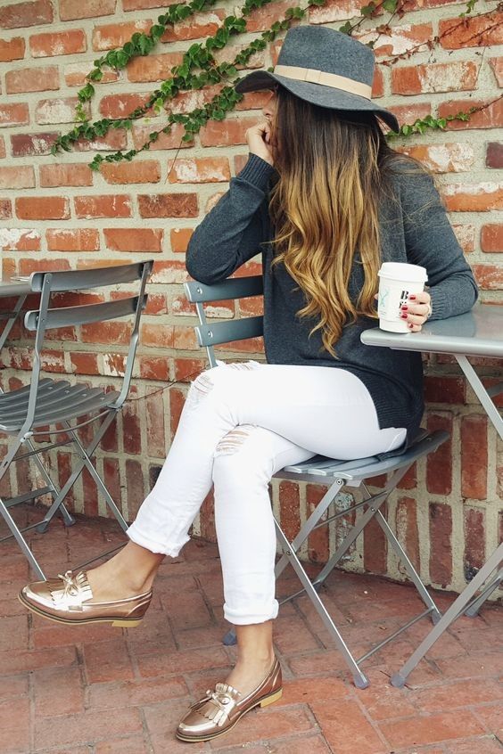 Si no quieres mostrar pierna, mezcla tus mocasines (dorados o plateados) con unos frescos jeans blancos para verte más girly que nunca.