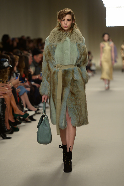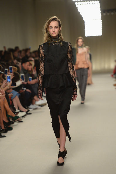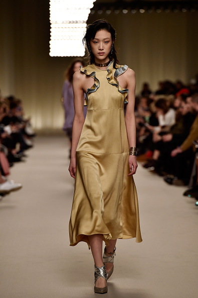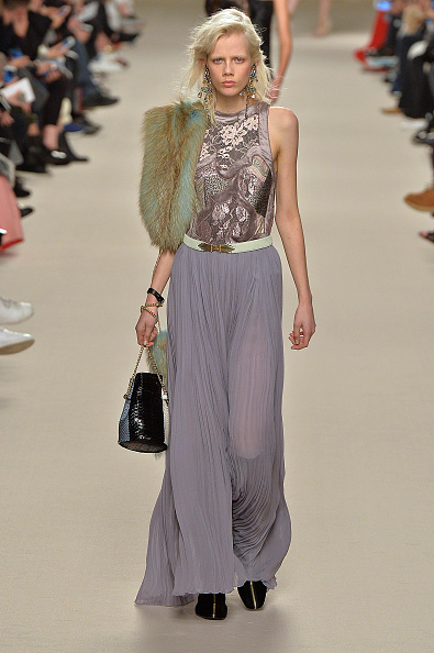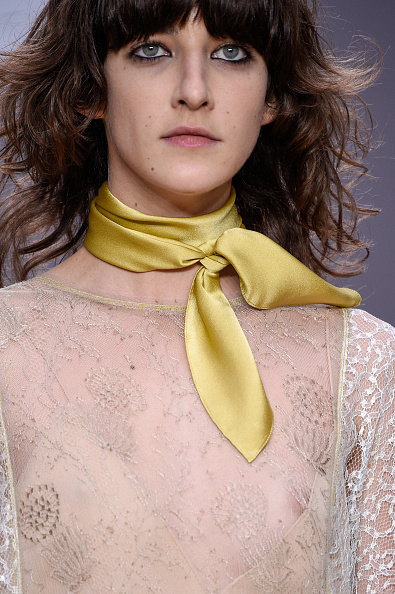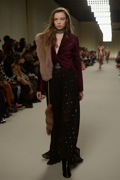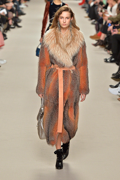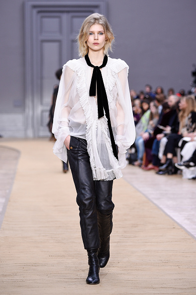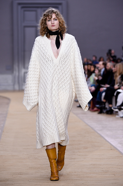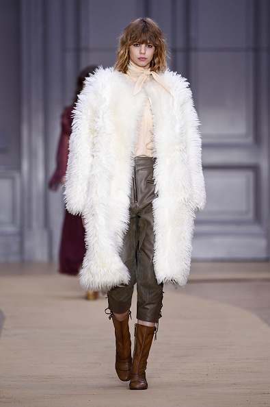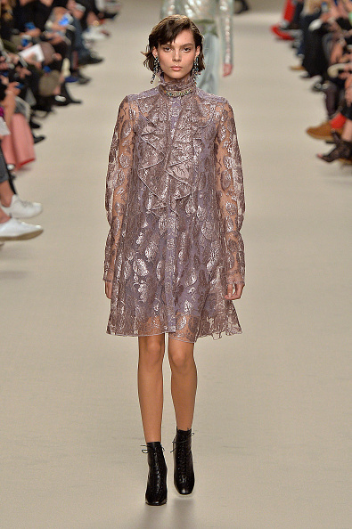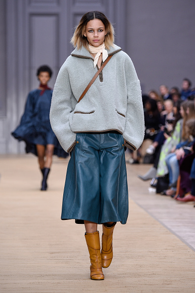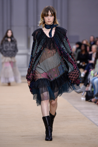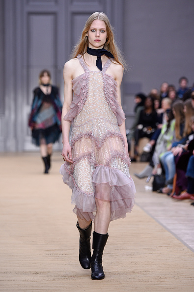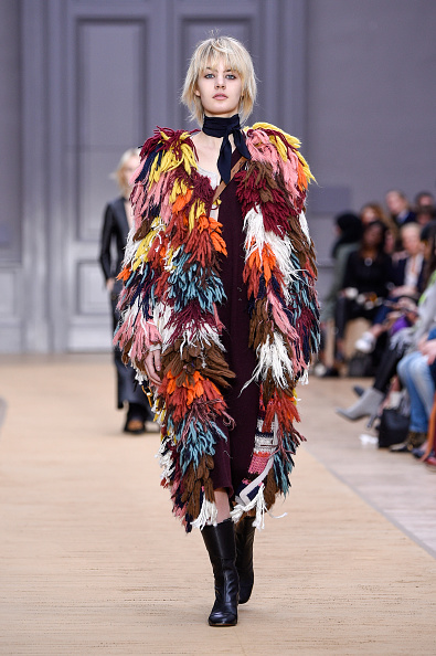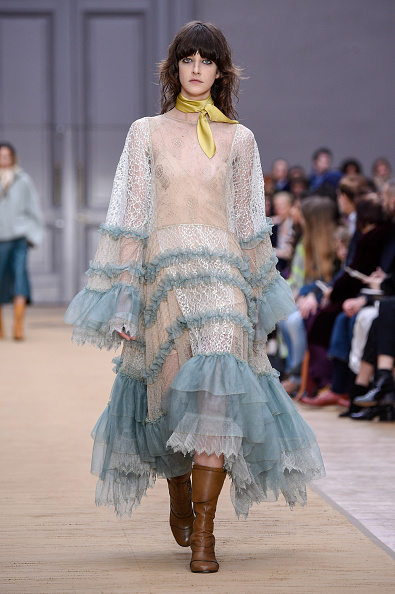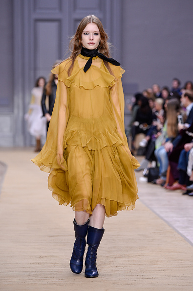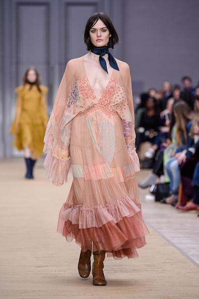 Chloé: Los choker top, los abrigos largos, de colores, los aires boho y los colores lila, mostaza, café y turquesa fueron los más usados en esta colección. Las texturas en olanes, polipiel y encaje hacen una mezcla boho con toques de la década de los 70.