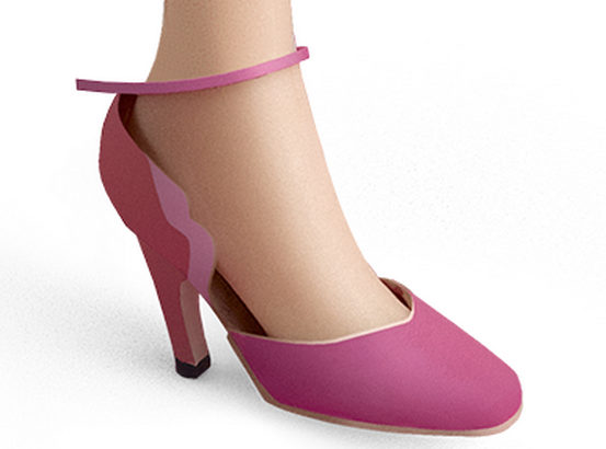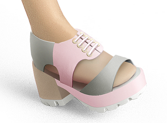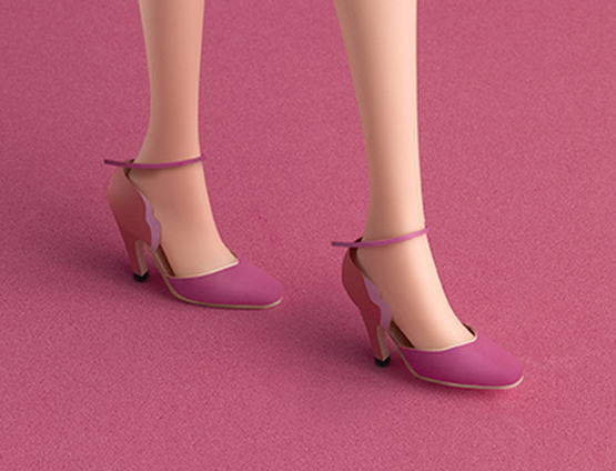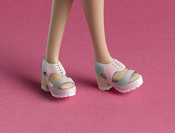 Naguisa le dio a Barbie unas divertidas sandalias de cuero en tres piezas, las cuales tienen un poco de plataforma y tacón de madera. Tiene una elegante mezcla de colores, pues utiliza el gris y el rosa.