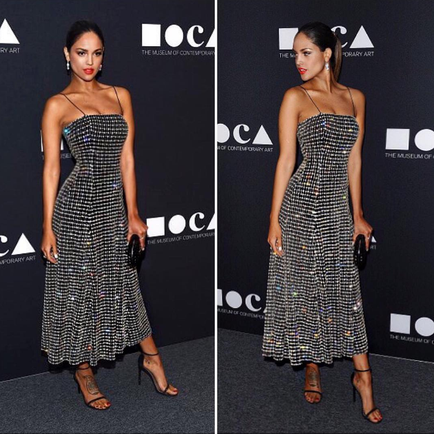 Hace unos días la mexicana dejo con “la boca abierta” a muchos asistentes a la fiesta de Warner Music y no solo por su belleza sino por el vestido que portaba que la hacia lucir espectacular. El diseño fue confeccionado en lentejuela por la diseñadora Rachel Zoe. El look se asemeja a la princesa Jasmín. Para dar armonía con el espectacular vestido, en cuestión de maquillaje optó por sombras para ojos en color azul metálico y un tono rosado en los labios. Un par de sandalias de tacón plateadas estilizaron además su silueta.