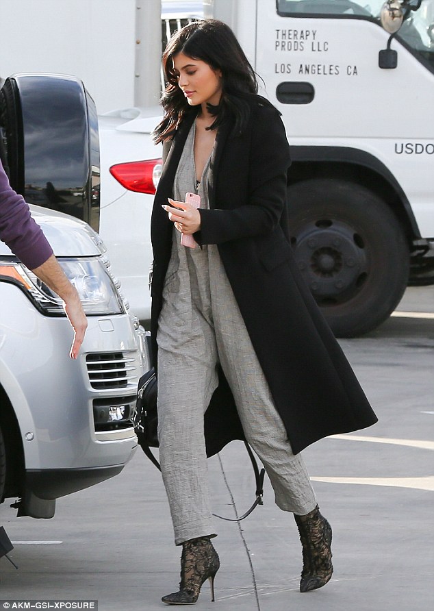 Kylie coordinó muy bien sus nuevos pares de zapatos, pues lo hizo con un jumpsuit gris y un abrigo negro que la hizo lucir elegante y sofisticada.