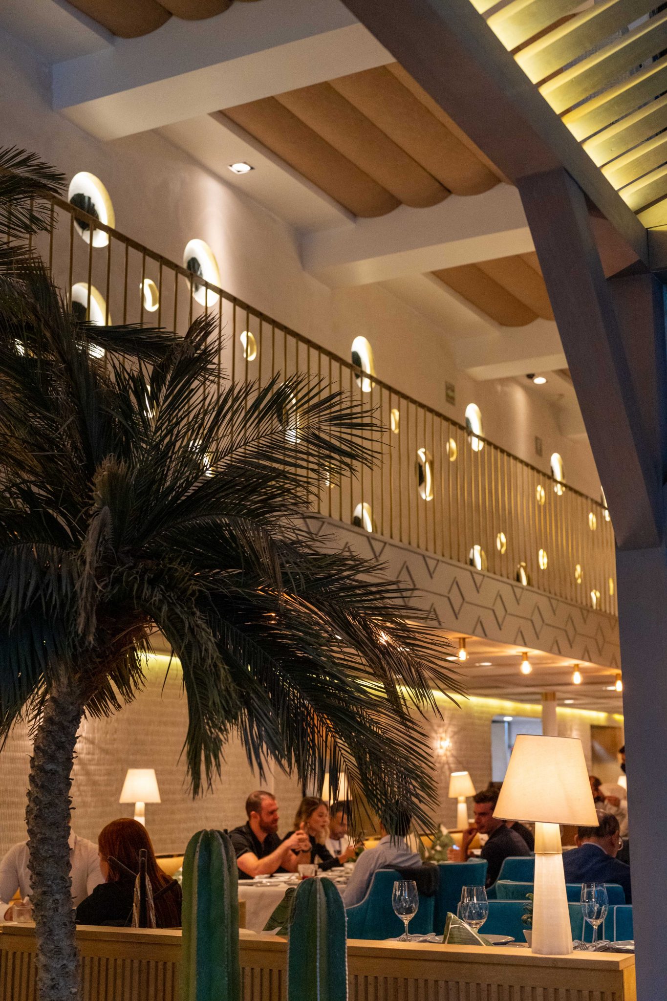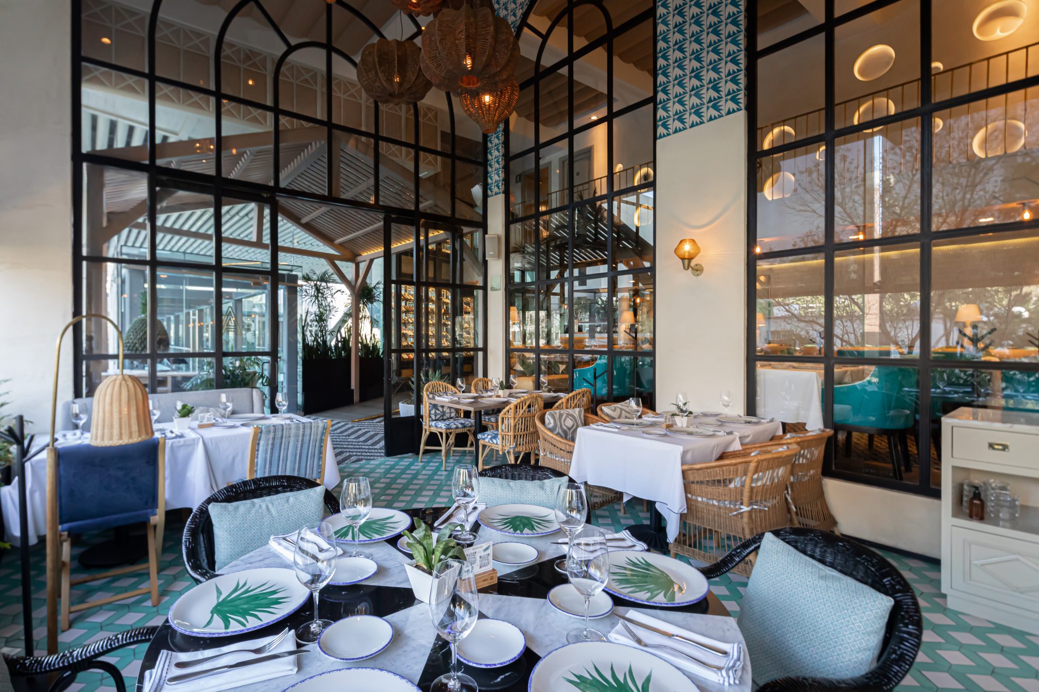 El salón, que posee una elevación de 45 cm con respecto a la terraza para darle importancia y jugar con distintos ambientes, mezcla distintos prints, mientras que telas con patrones a rayas y étnicos dan movimiento y color. Frescura y luz son adjetivos que describen sus espacios. Acentos visuales son sus dos bares, puntos focales del restaurante, uno por la gran palmera, la cómoda sala que se encuentra inmersa en las cavas personalizadas y la incomparable chimenea, y otro por su iluminación dramática junto a la gran cava del lugar, con vinos únicos.