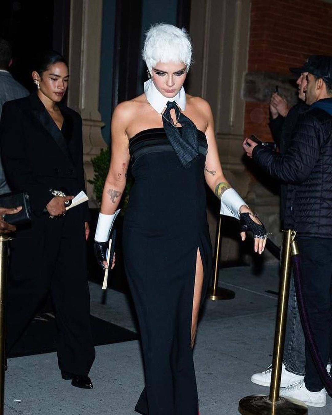 El after party de la MET Gala se caracterizó por contar con vestidos reveladores en negro, con diseños que priorizaron las transparencias y los escotes. Como el look de Kendall, uno de los más reveladores de la noche, el cual fue una recreación tributo por parte de Nensi Dojaka, de uno de los diseños más icónicos de Karl Lagerfeld.