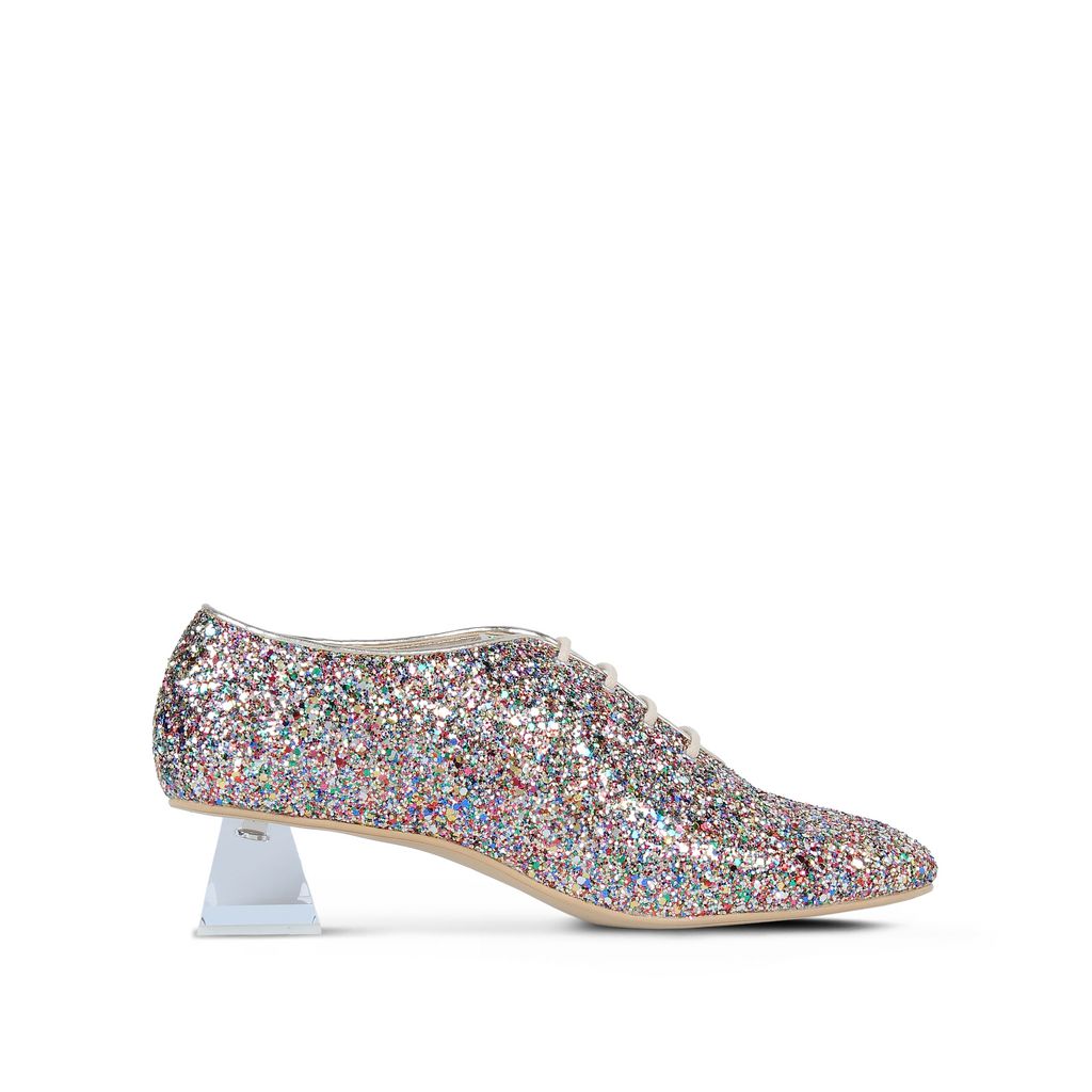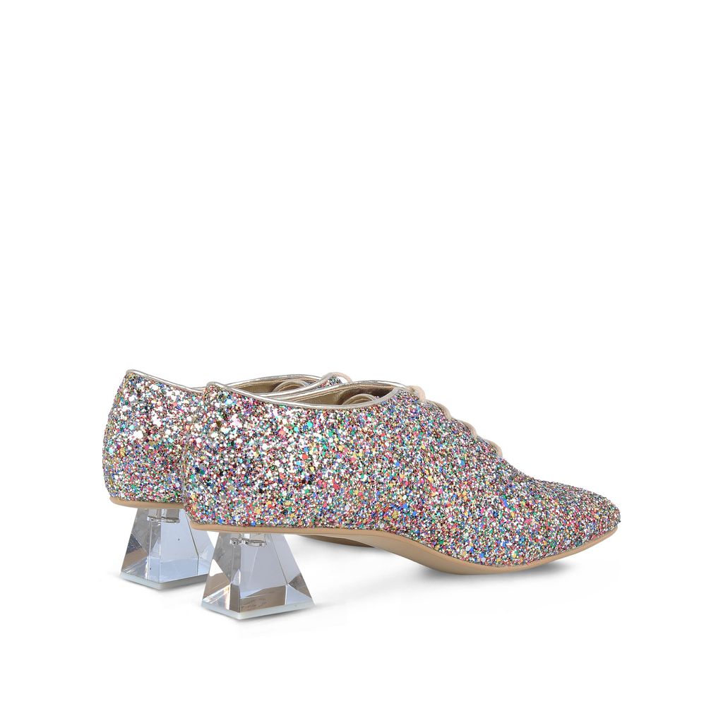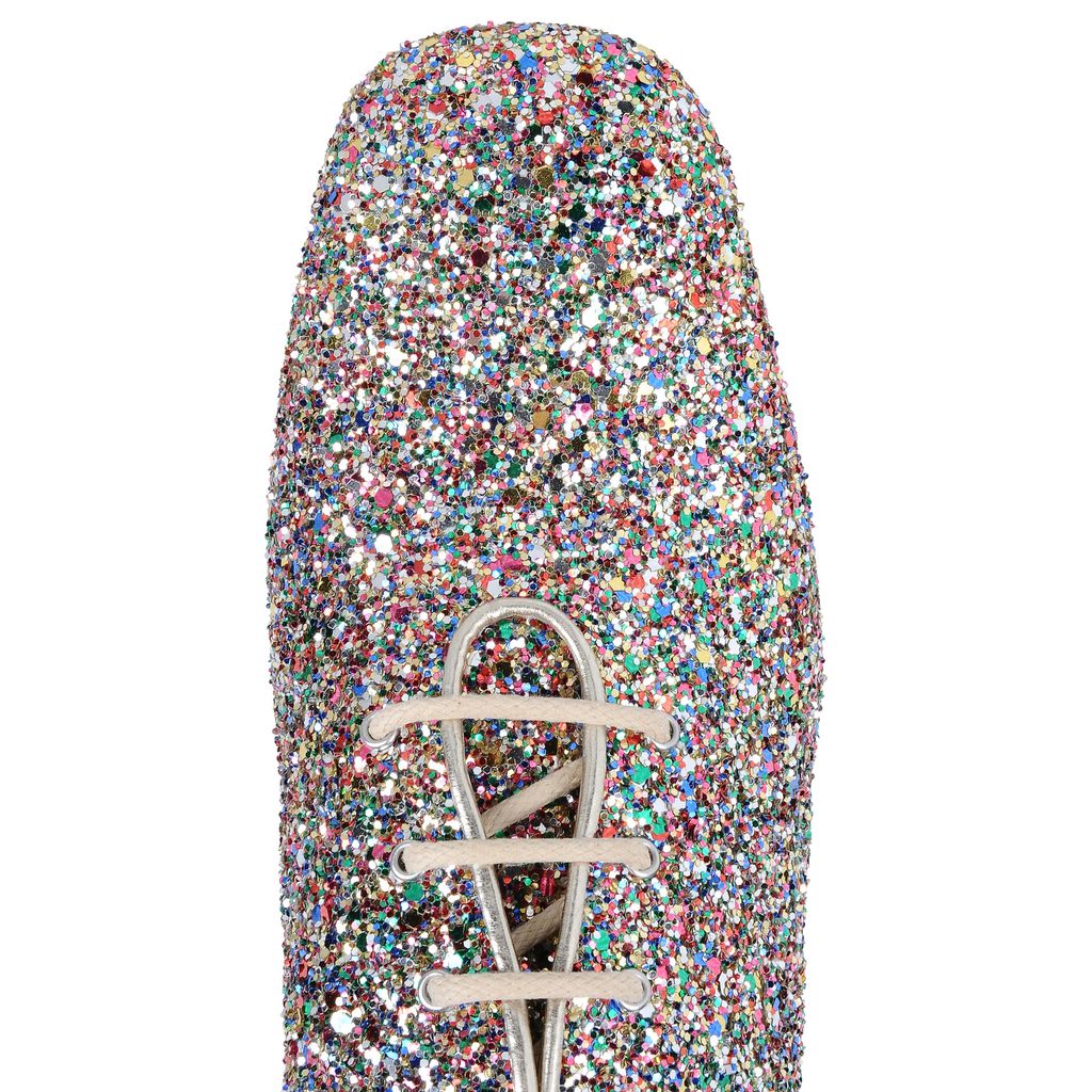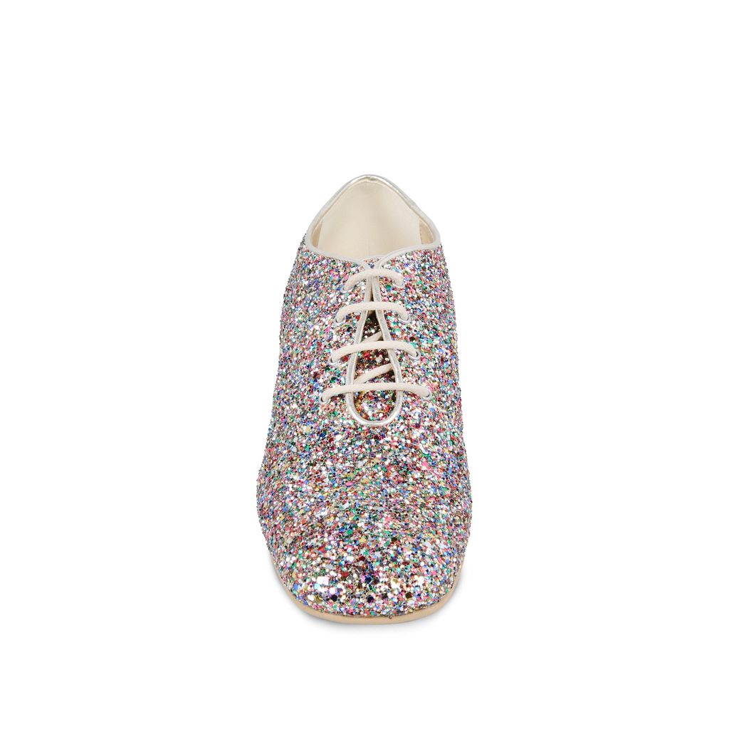 Estos zapatos son perfectos para andar cómoda todo el tiempo y lucir con mucho estilo, pues gracias a su mini tacón en forma piramidal, te dan un gran soporte para que tu pie no se canse. Tiene el estilo de unos boy shoes pero el glitter les da toda la magia femenina que necesitas.