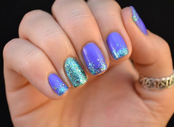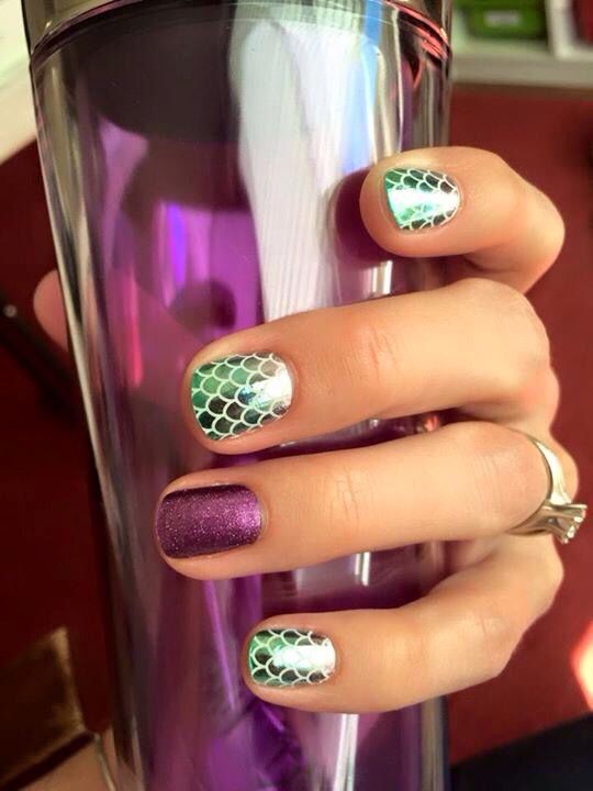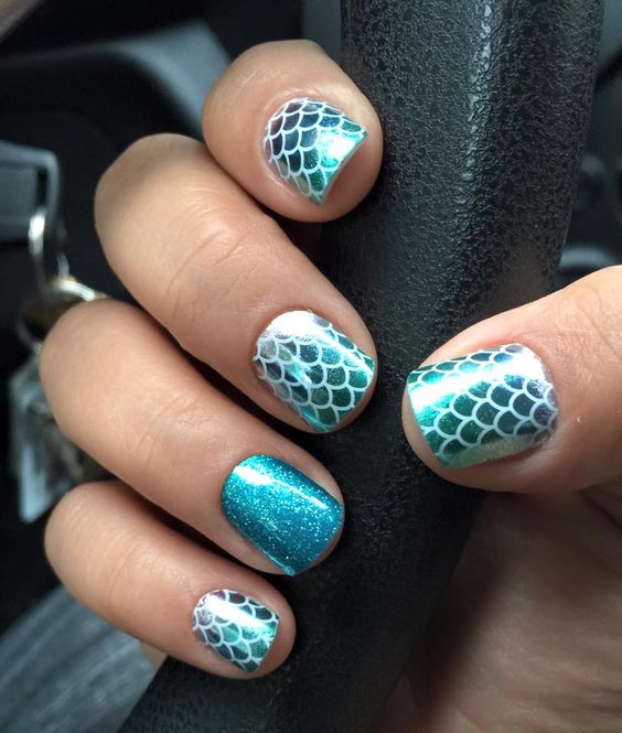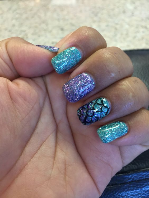 Si quieres que tu mani se vea como el de toda una sirena, este es el ideal para ti. Lo único que debes hacer es degradar el color que desees tener de oscuro a claro, después de conseguir solo dibuja sobre tu uña unas pequeñas escamas.