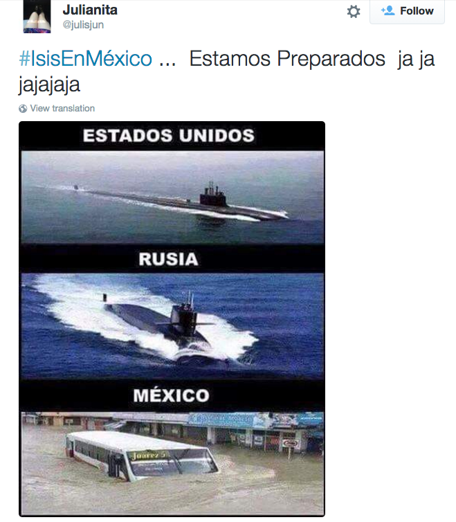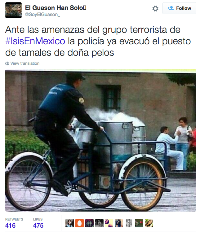 Por supuesto que las reacciones en redes sociales no se hicieron esperar, y es que los mexicanos recurrieron al humor para responder al grupo fundamentalista. Con el hashtag #ISISenMéxico, circularon infinidad de memes que demostraron el poco temor que causó esta amenaza en la población. Aquí te dejamos los mejores.