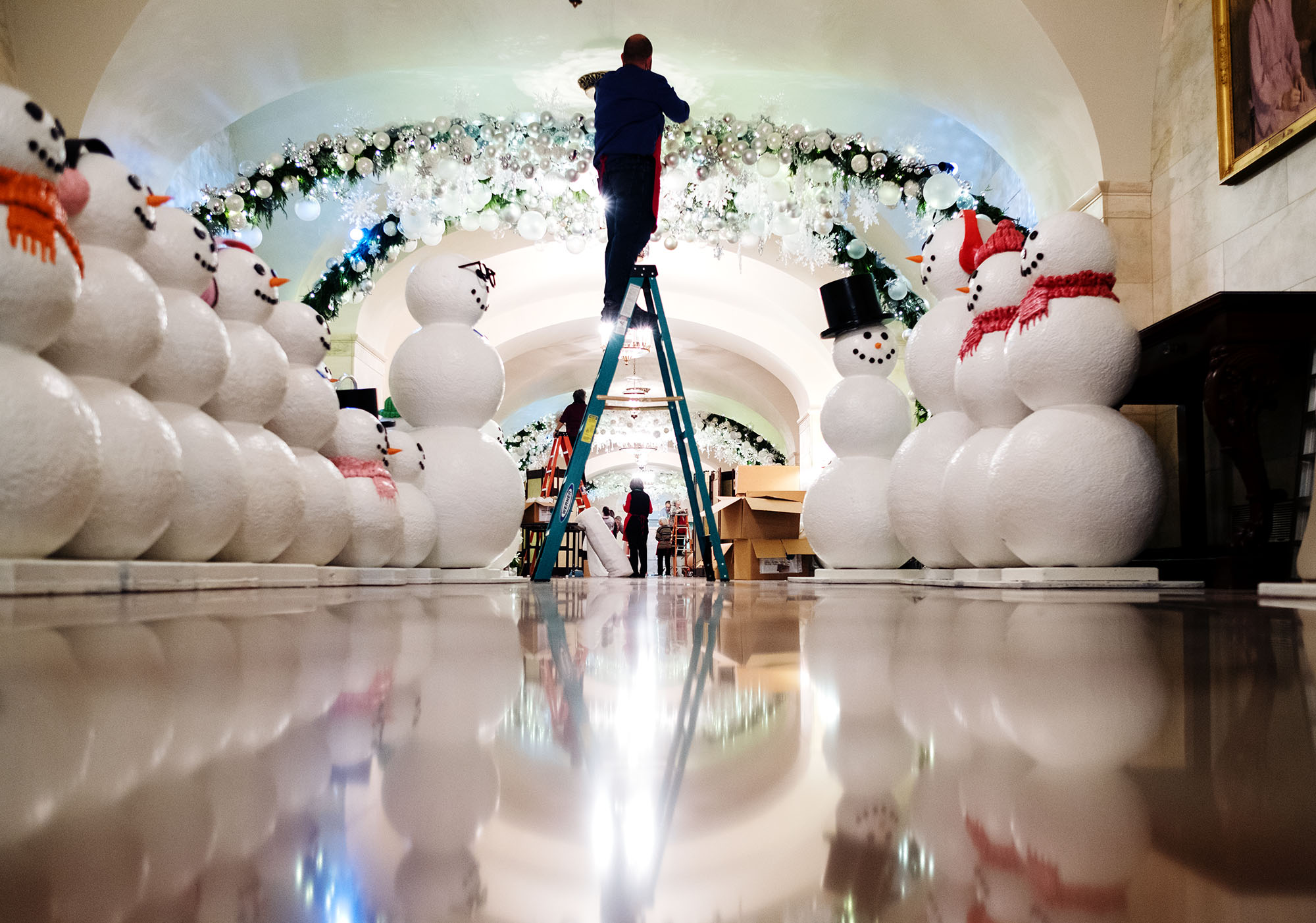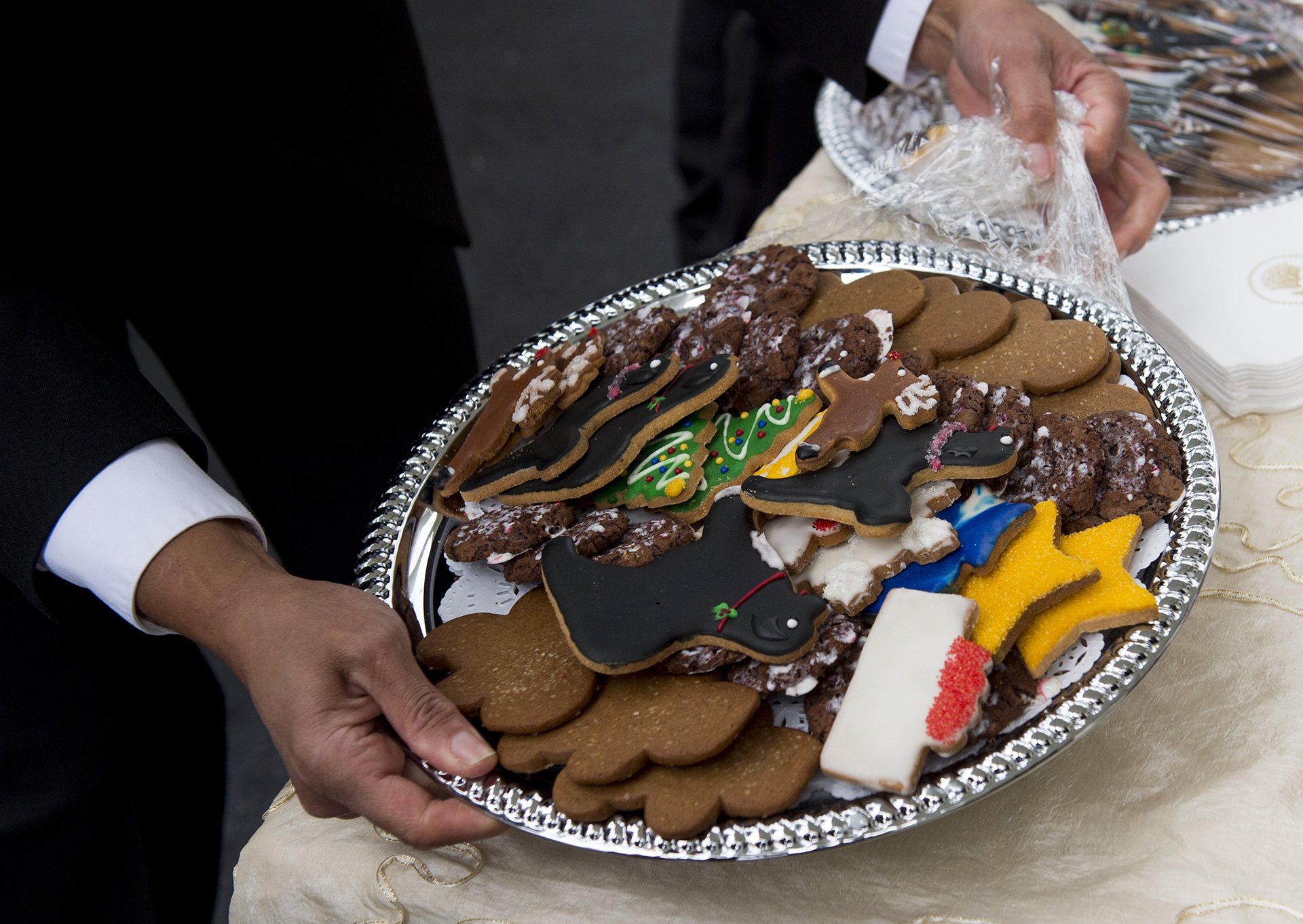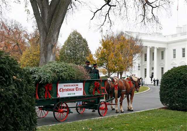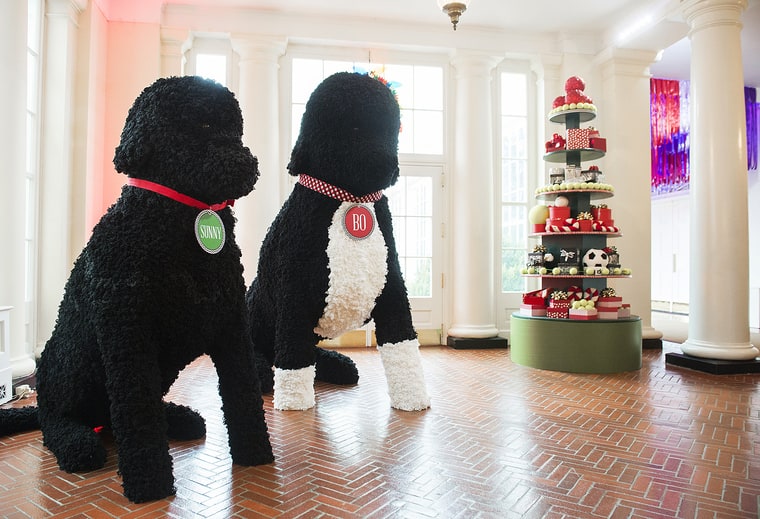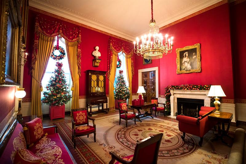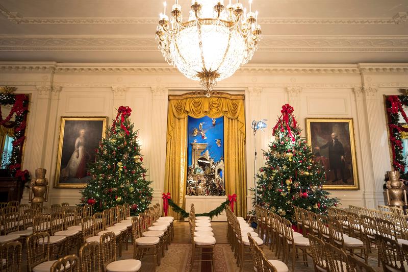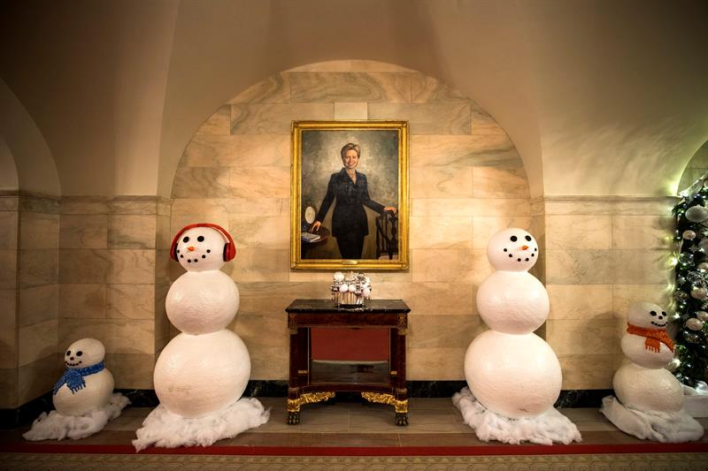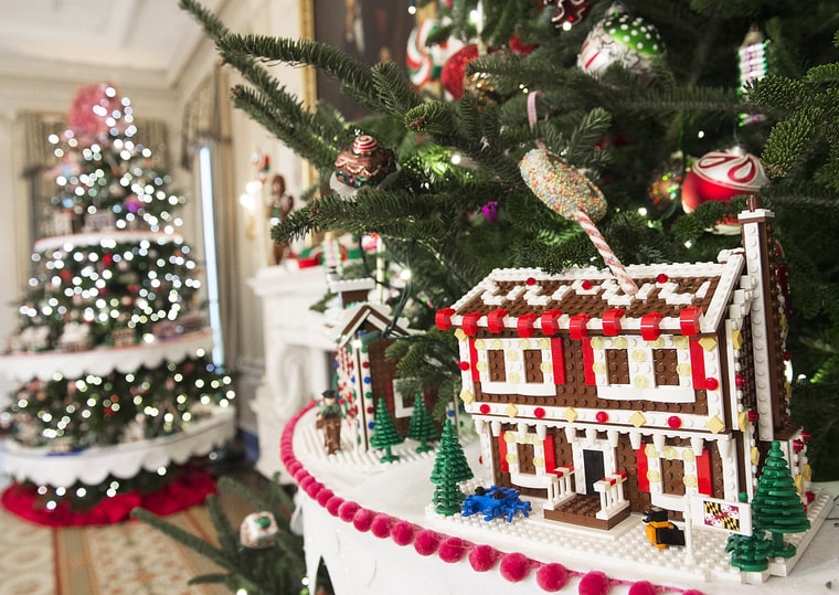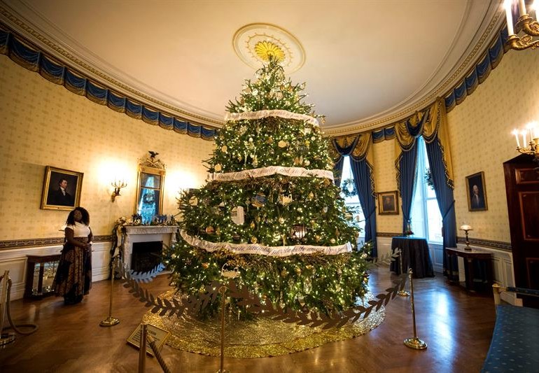 Un gran árbol se convierte en el protagonista de los adorno en el Salón Ázul, y como en años anteriores, Michelle Obama enfatizó que fue podado en honor de militares y sus familiares. De igual forma no sería navidad sin dulces de jengibre, y en la Casa Blanca adornaron con un muñeco de jengibre de 68 kilos cubierto con 45 kilos de masa de pan para formar el exterior blanco.