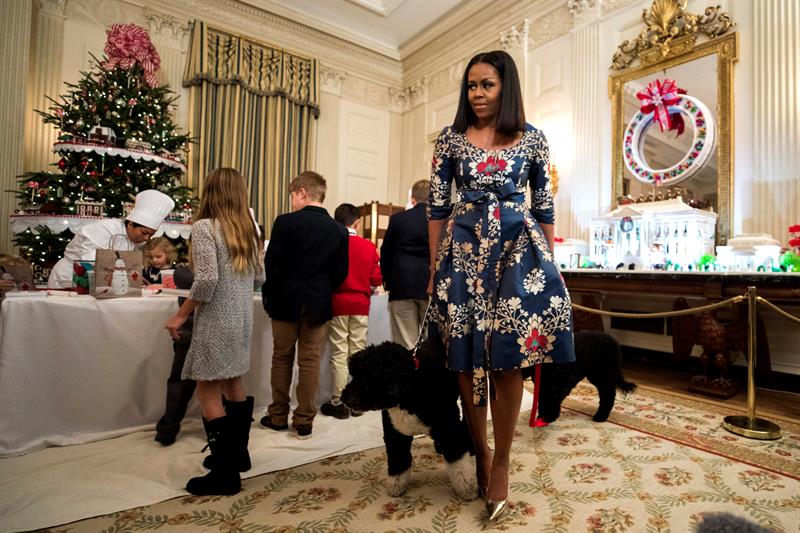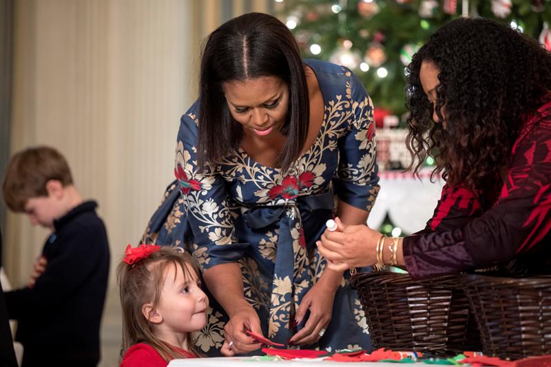 La actual Primera Dama de los Estados Unidos ha terminado con su última decoración navideña en la Casa Blanca. Michelle quiso en está ocasión destacar mediante sus adornos sus iniciativas principales como primera dama: servicio, educación y salud.