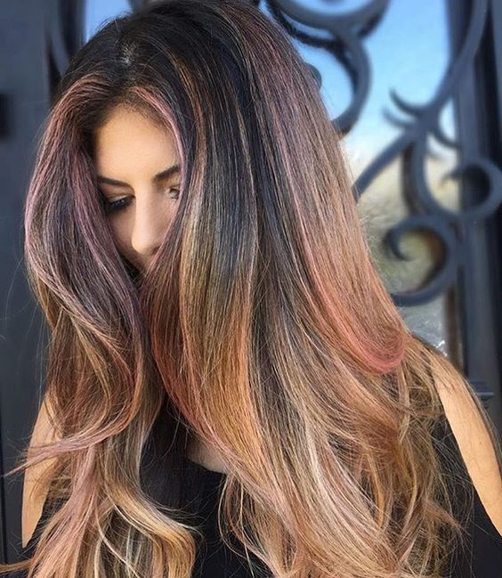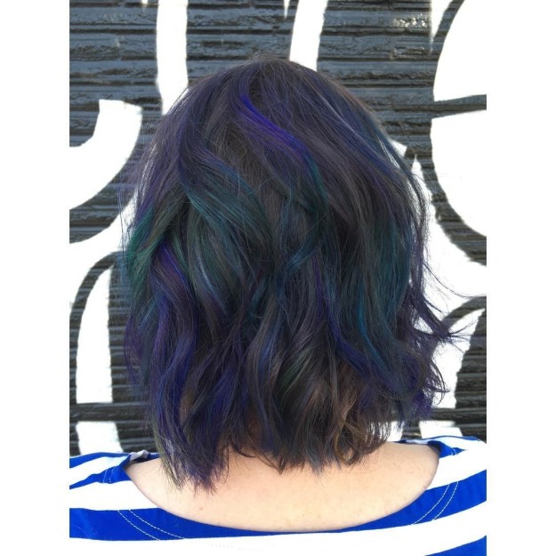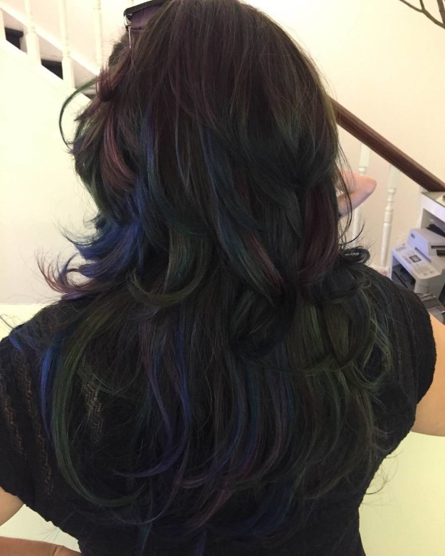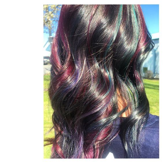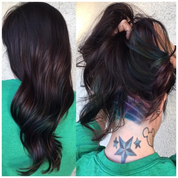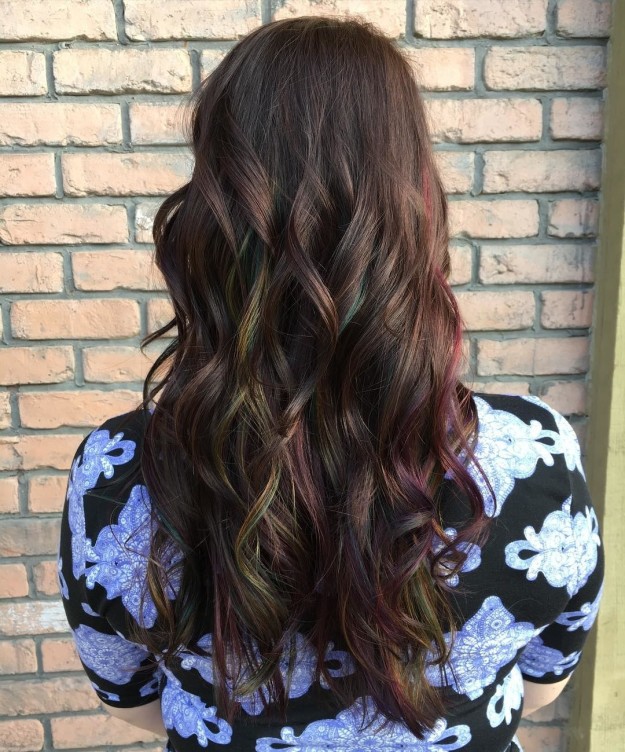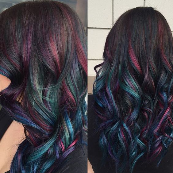 Ideal para los tonos castaños, pues no necesitas decolorar tu pelo y con ello, no tendrás porqué maltratarlo, esta técnica de cabello consiste en teñir mechones de colores variados que podrían simular ser una mancha de aceite (sí, como las que quedan en el concreto y les da el sol).