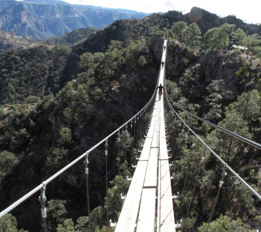 Estos puentes colgantes están elevados a una altura de 450 metros y su tiro es de un kilómetro 113 metros y pasan por encima de la comunidad rarámuri de la zona, los que se encuentran en el fondo de la barranca.