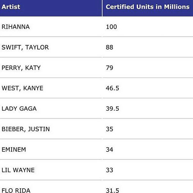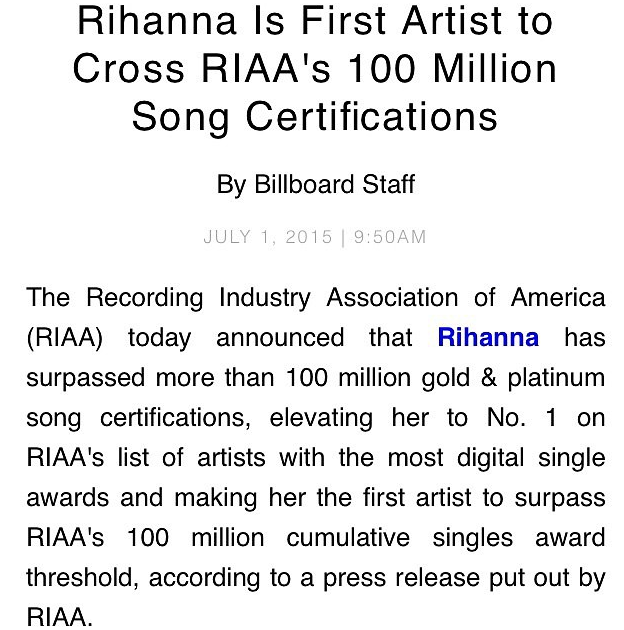 A través de un comunicado, el quipo de Billboard señaló que Rihanna sobrepasó más de 100 millones de certificaciones de canciones de oro y platino y es la número uno de la lista RIAA con el mayo número de premios en canciones digitales.
