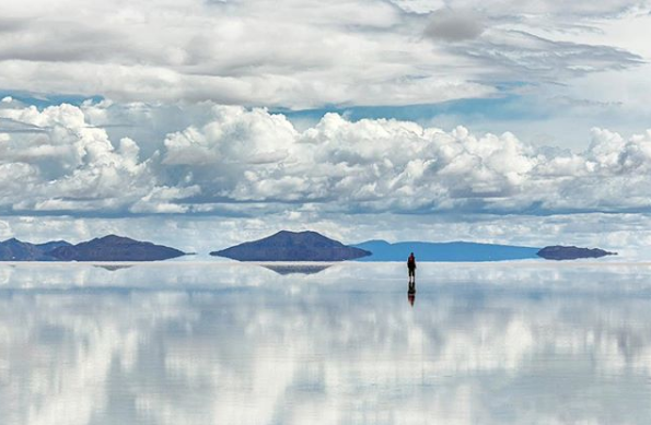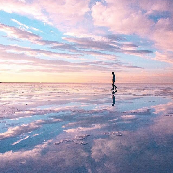 Cuenta con más de 10,000 kilómetros cuadrados de sal que, dependiendo de la época del año en que la visites, se funden con el cielo eliminando el horizonte o contrastando con el azul del cielo.