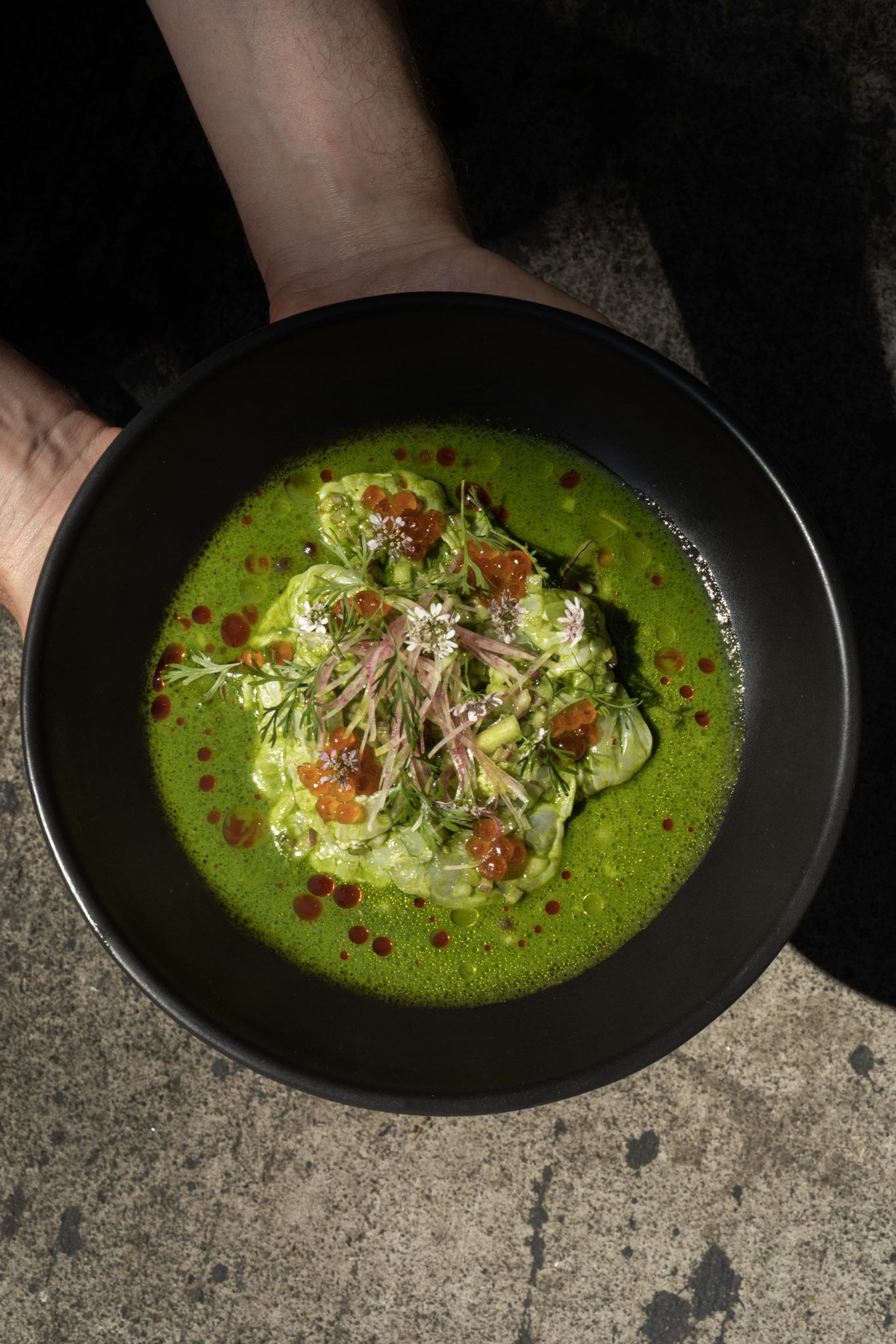 En su menú, que continuamente observa los ciclos estacionales, se incorporan distintas tradiciones, siempre enfatizando en la temporalidad de sus materias primas y su trazabilidad. En la degustación, los epicúreos encontrarán una propuesta inédita que se aprecia desde los entrantes, como un aguachile de chilhuacle de Oaxaca, cebolla morada, jícama y pepino, o unos sopes de maíz, hechos a mano, con escamoles.