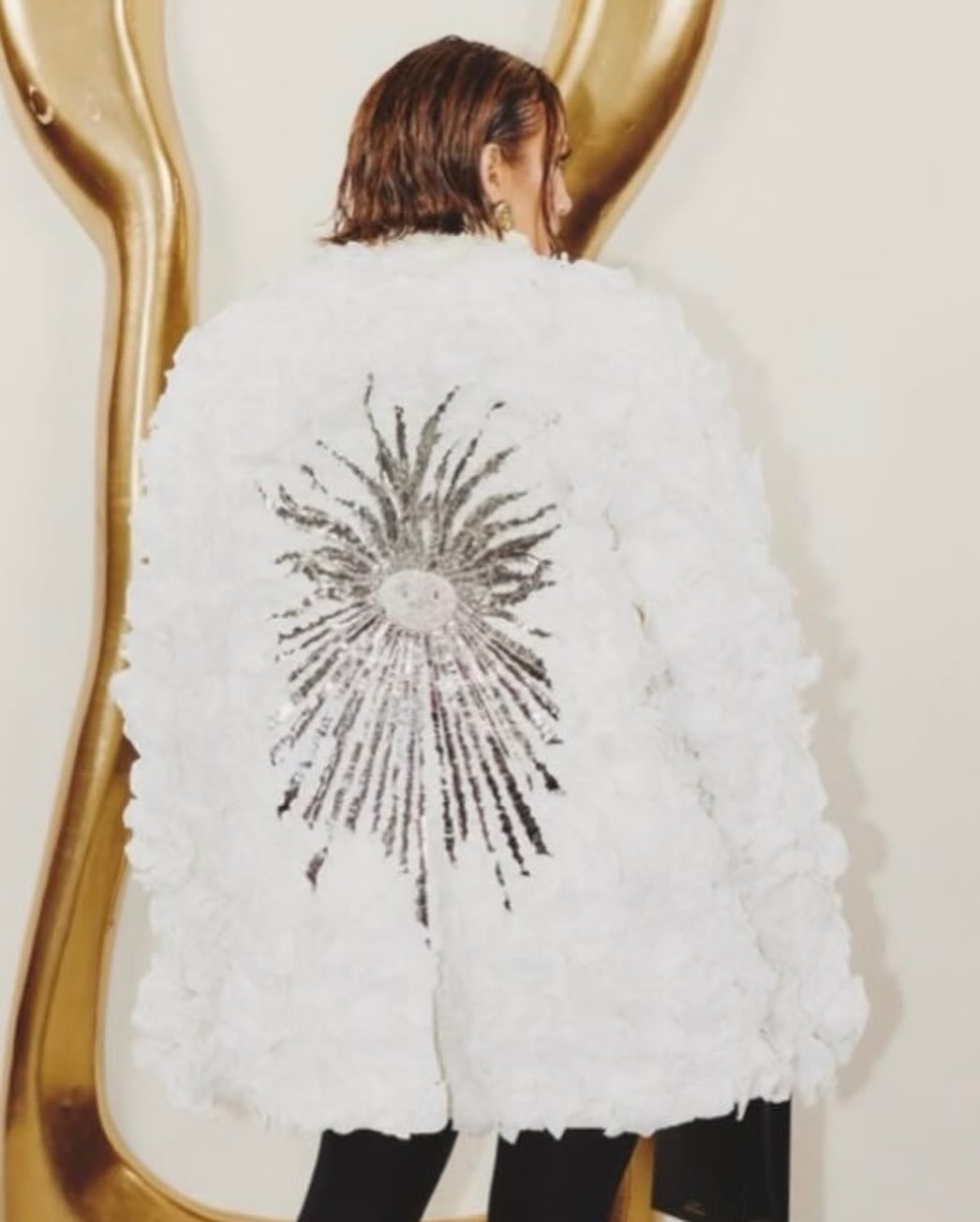 La actriz y cantante de 54 años llegó al lugar de la cita con un abrigo como pieza statement. A lo lejos parecía un abrigo con volumen y tela corrugada, pero una vista más de cerca nos permitió ver el verdadero trabajo de esta pieza.