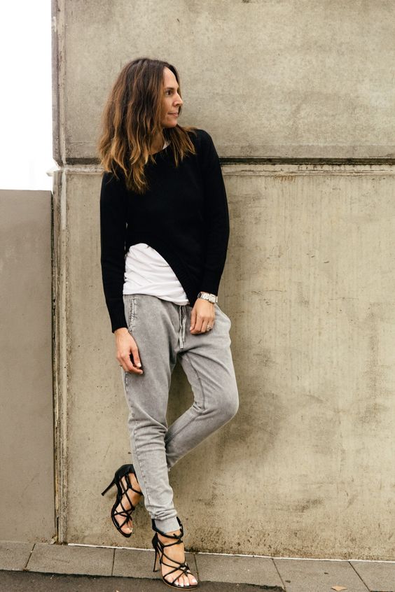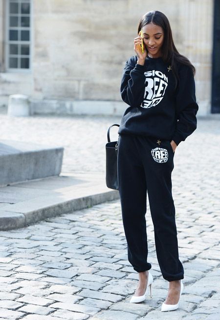 Si estás planeando ir a cenar o tomar algo con tus amigas, crea un ‘total black look’ armado con sweatpants, blazer, tacones y un lindo clutch.