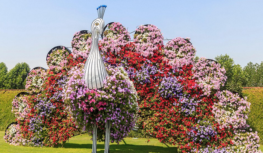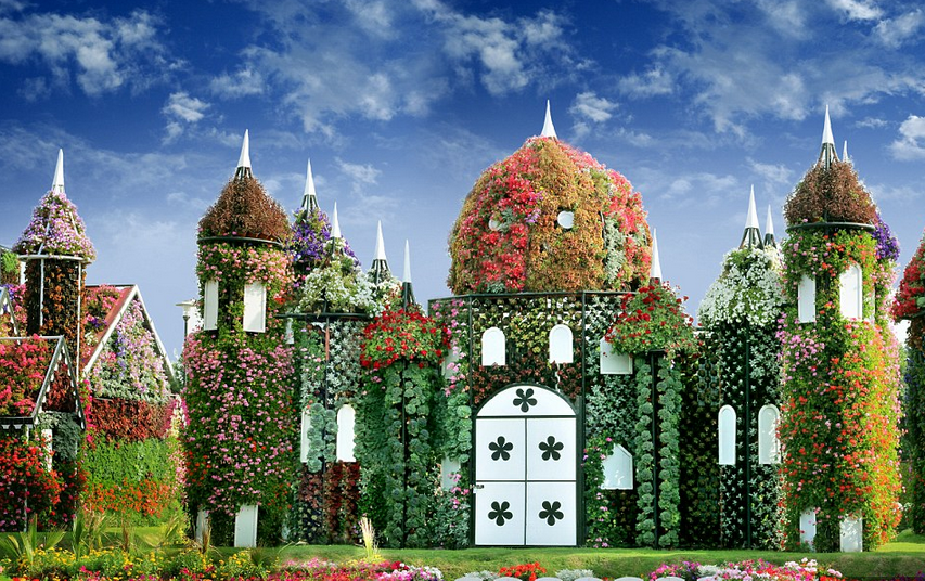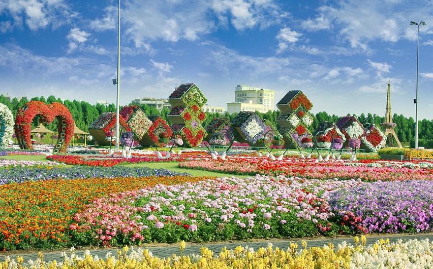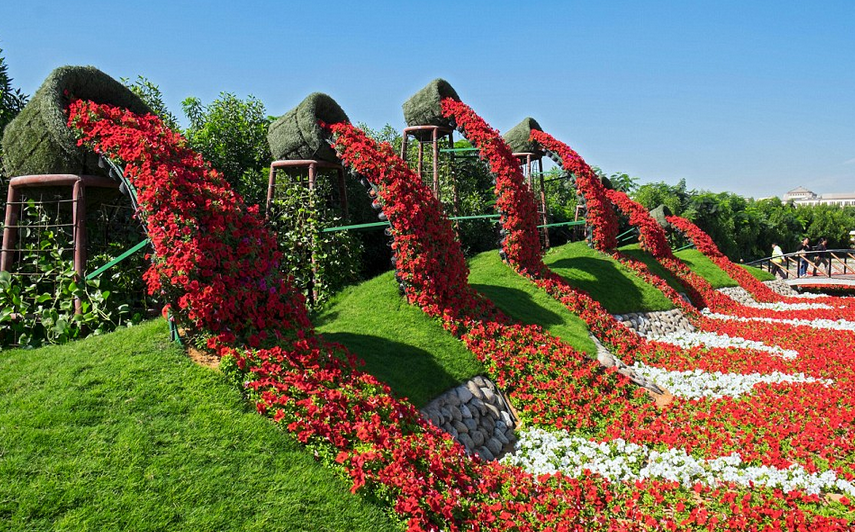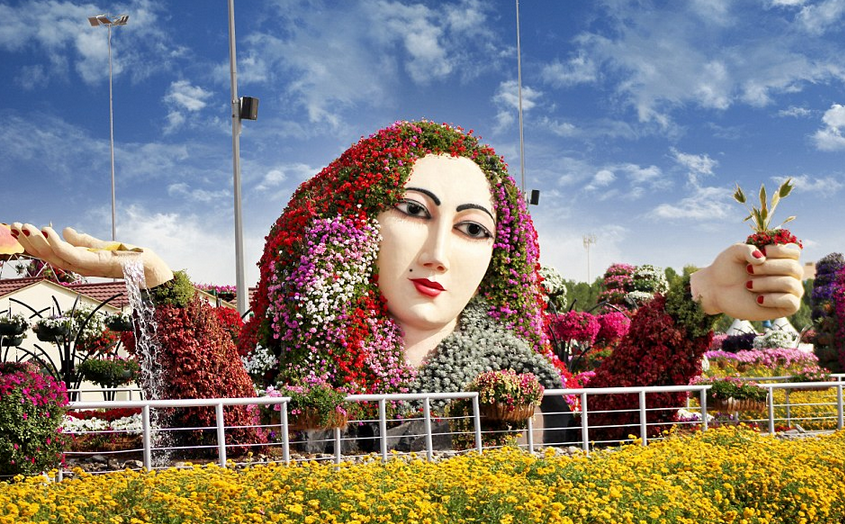 Este increíble oasis está considerado como un enorme milagro gracias a que se encuentra en medio de una zona árida. El arcoíris natural que se crea en este impresionante lugar es formidable, pues inclusive existen animales artificiales que también están hechos de flores.