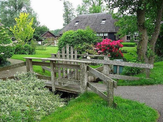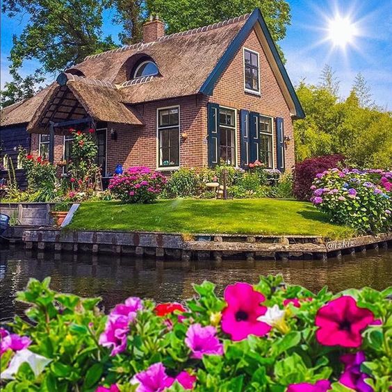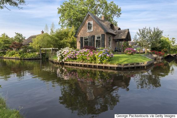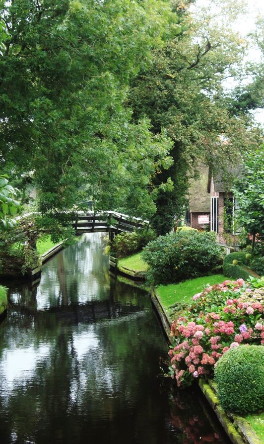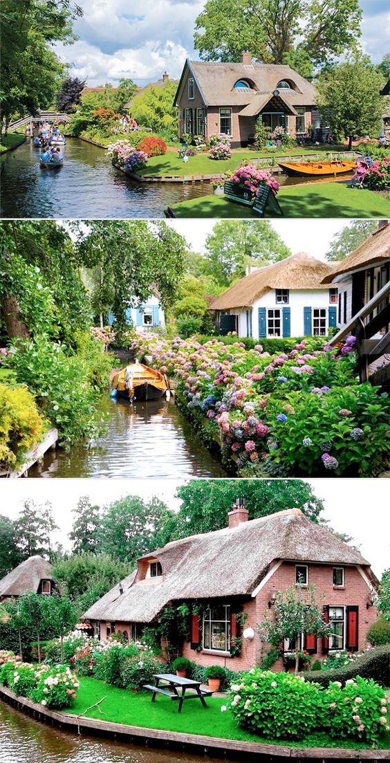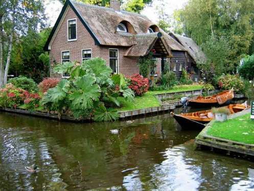 Giethoorn en Holanda, a 75 millas al noreste de Amsterdam un idílico pueblo que esta rodeado por 4 millas de hermosos canales al pie de sus puentes de arco de madera. El modo de traslado para sus habitantes es en botes y remando. Las casas tienen techos de paja que datan del siglo 18.
