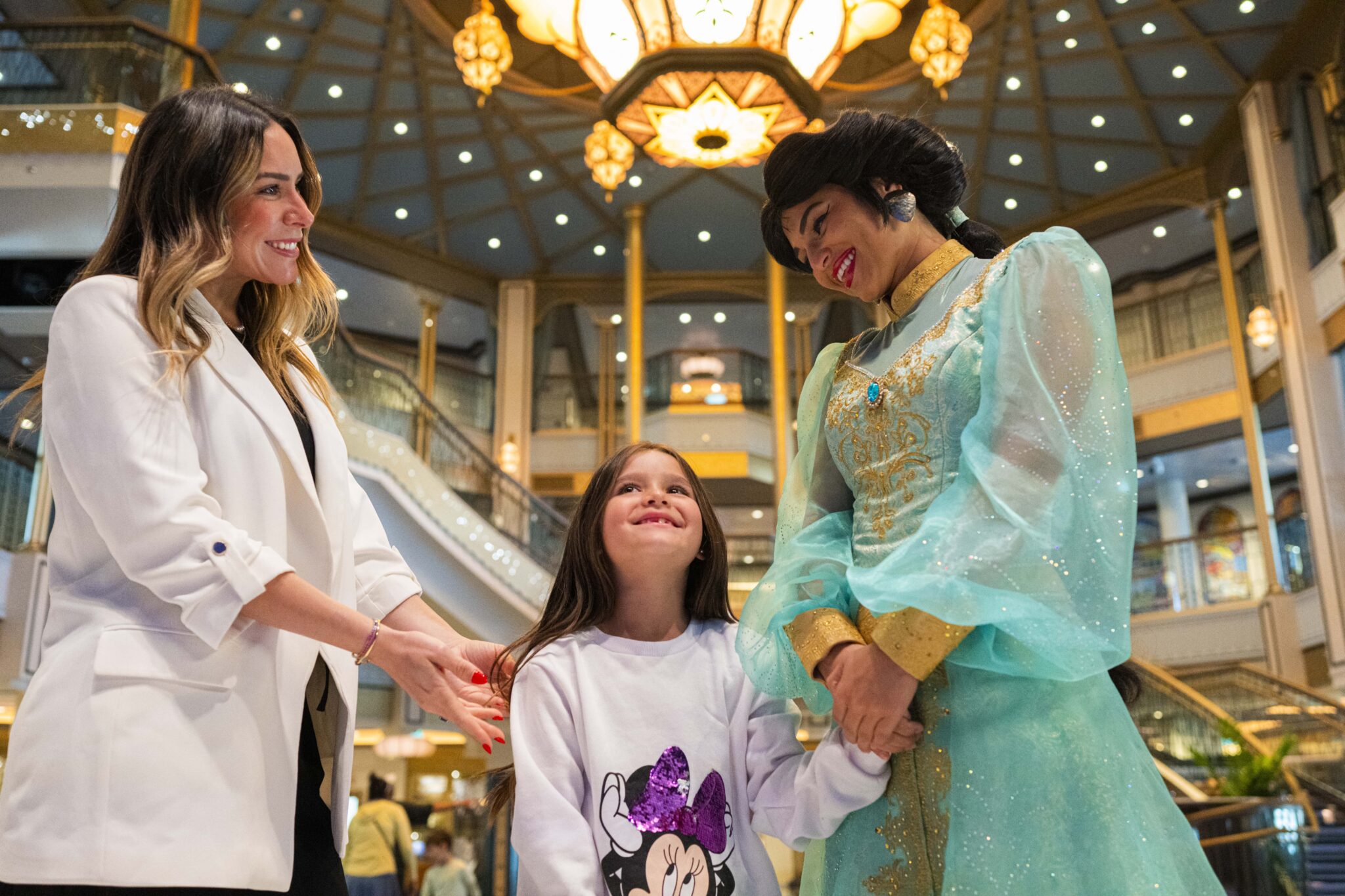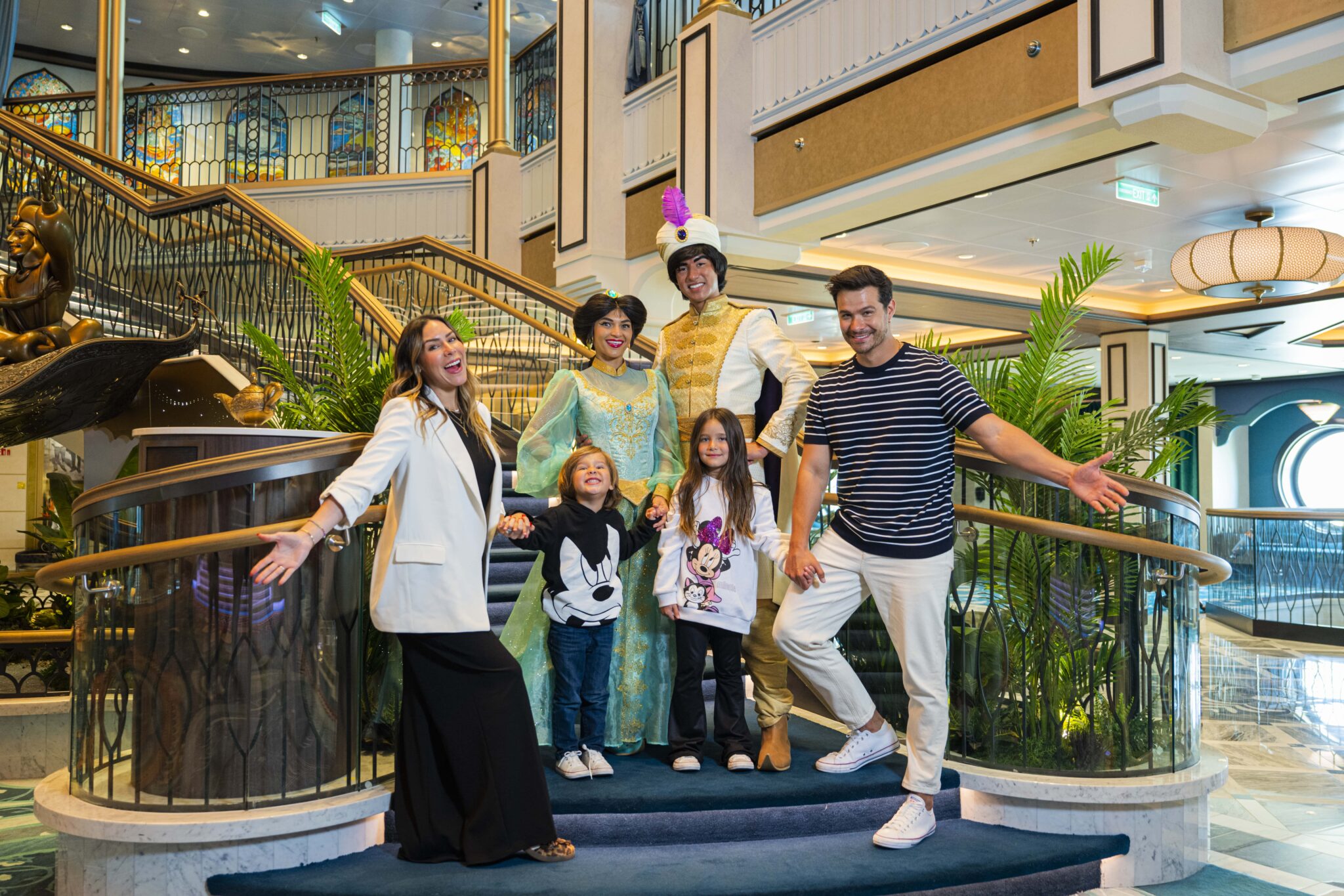 Con la emoción de la llegada de un nuevo bebé en camino, la familia aprovechó esta escapada para disfrutar de unos días llenos de sorpresas y emociones. Desde su llegada al Grand Hall, inspirado en la ciudad de Agrabah, fueron recibidos por Aladdín y la princesa Jasmine, quienes les dieron la bienvenida a una experiencia donde la magia de Disney se respira a cada paso.