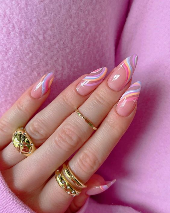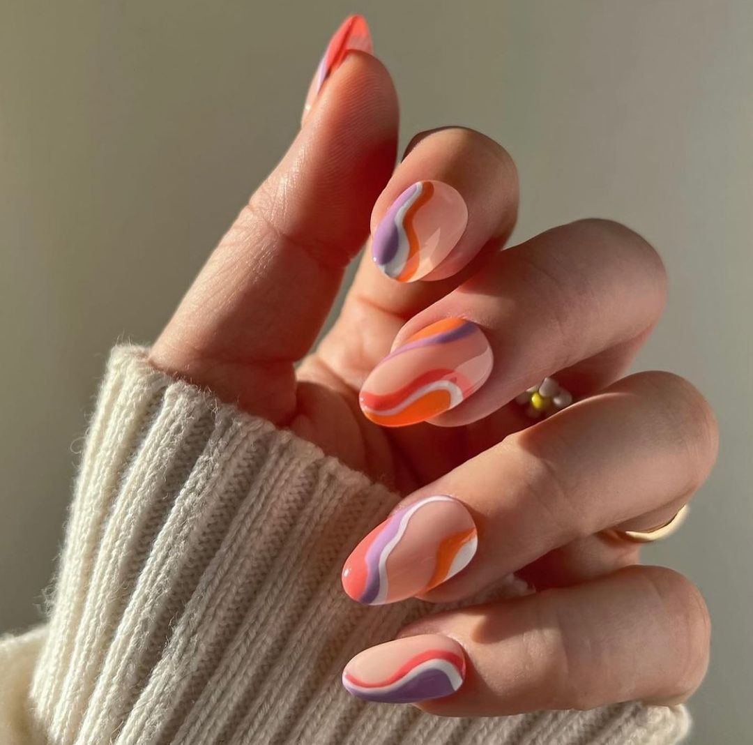 Las ondas groovy son la inspiración retro que llegó para quedarse y vuelve a posicionarse entre los diseños favoritos este verano. El azul, verde y anaranjado son nuestros favoritos, pues lucen perfectos cuando se llevan juntos, al igual que cuando decides llevar uno solo en todas las uñas.
