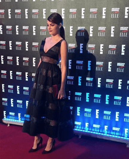 Luciendo un hermoso vestido negro con transparencias y caída en tamaño midi de la diseñadora mexicana Alexia Ulibarri. La también actriz usó zapatos de la casa francesa Louis Vuitton y un clutch de Longchamp.