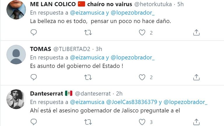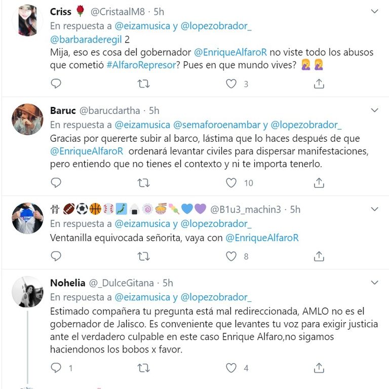 De inmediato, usuarios que apoyan al mandatario comenzaron a enviarle mensajes a Eiza, asegurando que a quien debió escribir eso es a Enrique Alfaro, gobernador de Jalisco, y no a Andrés Manuel López Obrador. Fue entonces cuando la también cantante, comenzó a recibir ataques en esa misma red social: